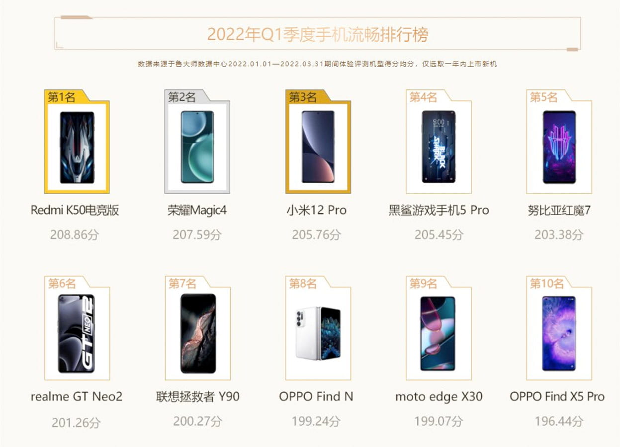 Cụ thể hơn, bảng xếp hạng ghi nhận 2 mẫu máy của Xiaomi với đại diện là Redmi K50 và Xiaomi 12 Pro. Ngoài ra, OPPO cũng đống góp 2 đại diện là OPPO Find X5 Pro và OPPO Find N.