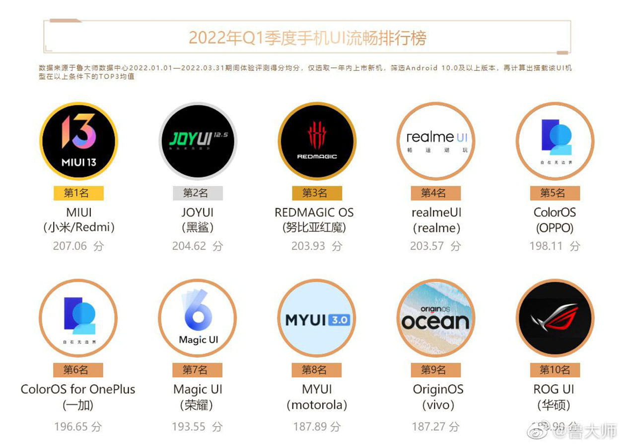 Vị trí dẫn đầu là MIUI 13 trên chiếc Redmi K50 phiên bản Esports với điểm số lên tới 208,86. Qua đó, đây cũng trở thành chiếc điện thoại di động mượt mà nhất của các thương hiệu Trung Quốc. Qua đó, MIUI 13 cũng trở thành hệ điều hành được đánh giá cao nhất với 207,06 điểm.