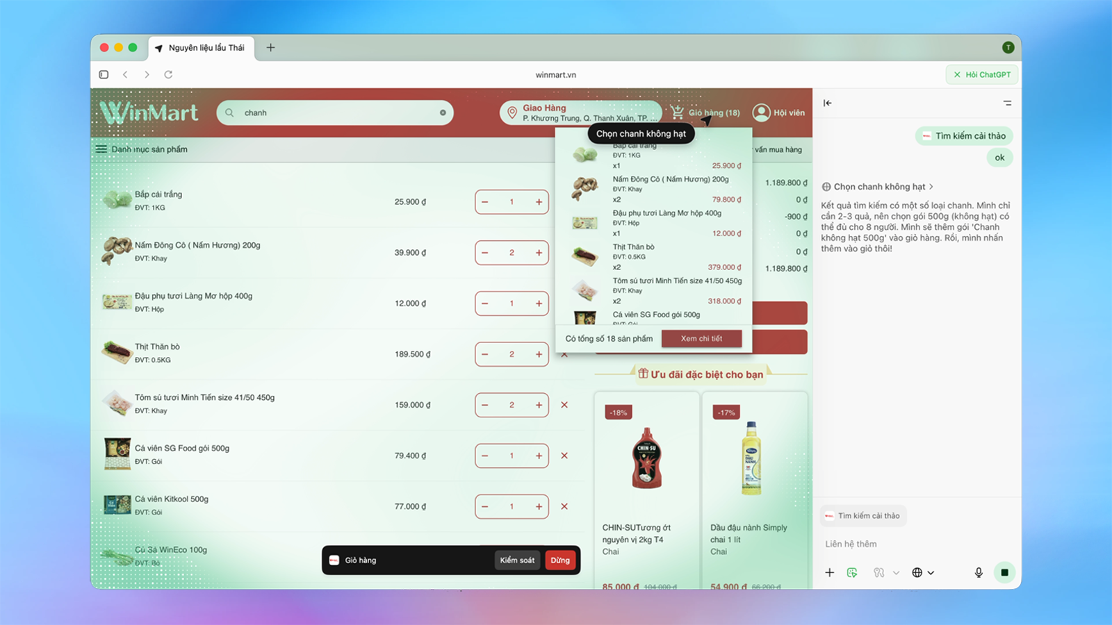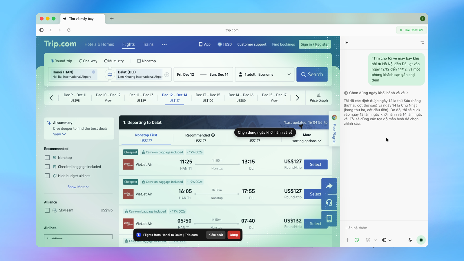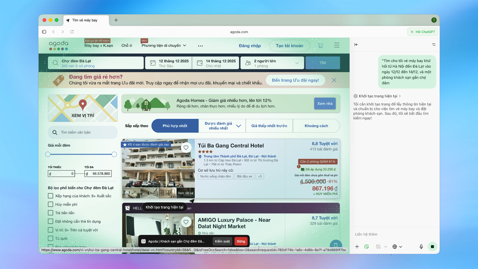 Tính năng đáng chú ý đầu tiên của Atlas là Agent Mode. Tính năng này cho phép người dùng yêu cầu ChatGPT kiểm soát trình duyệt để thực hiện các hành động phức tạp. Khi kích hoạt, Atlas sẽ hiển thị một con trỏ riêng và tự động thao tác thay cho người dùng. Ví dụ, bạn có thể ra lệnh: “Tìm vé máy bay khứ hồi từ Hà Nội đến Đà Lạt ngày 12/12 đến 14/12, và một khách sạn gần chợ đêm.” Agent sẽ tự truy cập các trang web đặt vé, lọc ra các lựa chọn và trình bày để bạn xét duyệt. Tương tự, bạn có thể yêu cầu: “Đặt nguyên liệu cho món lẩu Thái 8 người trên Winmart.” Agent sẽ phân tích danh sách nguyên liệu và thêm vào giỏ hàng.