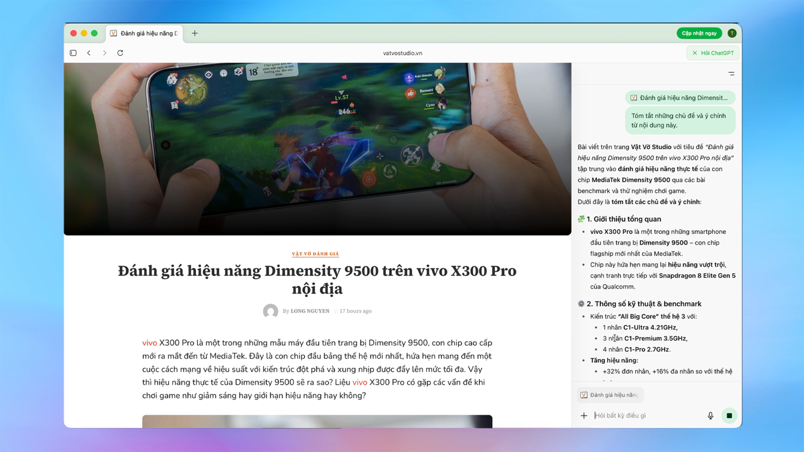 Điểm cải tiến này rõ rệt hơn khi so sánh với Chrome, nơi người dùng thường phải chuyển đổi liên tục giữa tab nội dung và tab ChatGPT. Thay vì quy trình sao chép – dán thủ công trên Chrome, Atlas tích hợp ChatGPT ngay bên cạnh trang web, cho phép xử lý nhanh và liền mạch các tác vụ như tóm tắt, phân tích ngay tại chỗ.