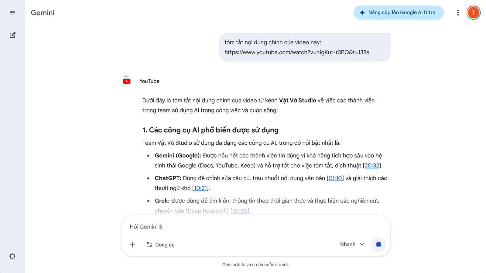 Việc phải xem toàn bộ một video dài chỉ để chắt lọc vài thông tin chính thường tiêu tốn khá nhiều thời gian. Với Gemini, bạn có thể trực tiếp tải lên các tệp video, âm thanh hoặc yêu cầu AI phân tích nội dung video ngay trên nền tảng YouTube. Ở giao diện xem YouTube, bạn có thể sử dụng nút “Hỏi” để yêu cầu liệt kê các ý chính; tuy nhiên, tính năng này hiện chưa khả dụng tại Việt Nam. Tương tự, khi tải một tệp video tài liệu dài từ máy tính lên, bạn chỉ cần dùng câu lệnh: ‘Những điểm chính của video này là gì?’. Nhìn chung, tính năng này hỗ trợ cực kỳ hiệu quả cho những ai cần ôn tập hoặc thu thập thông tin nhanh chóng mà không phải xem trọn vẹn toàn bộ video.