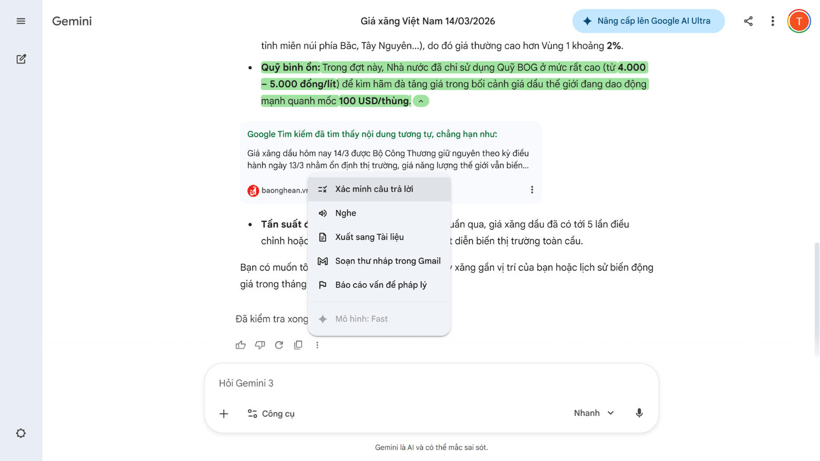 Các mô hình ngôn ngữ lớn đôi khi vẫn đưa ra thông tin không chính xác hoặc tự bịa ra dữ liệu (thường gọi là hiện tượng ảo giác AI). Để khắc phục vấn đề này, Gemini cung cấp tính năng “Xác minh câu trả lời” thông qua công cụ Google Search. Sau khi AI trả lời, bạn có thể chọn biểu tượng kiểm tra ở cuối văn bản để AI tự động đối chiếu nội dung với các nguồn trên internet. Những đoạn văn bản được tô màu xanh lá cây cho biết thông tin có nguồn đối chiếu rõ ràng kèm theo liên kết, trong khi màu cam hoặc đỏ cảnh báo thông tin chưa có cơ sở kiểm chứng. Dù người dùng vẫn cần tự đánh giá các số liệu quan trọng, tính năng này hỗ trợ đáng kể trong việc hạn chế rủi ro sai lệch thông tin.