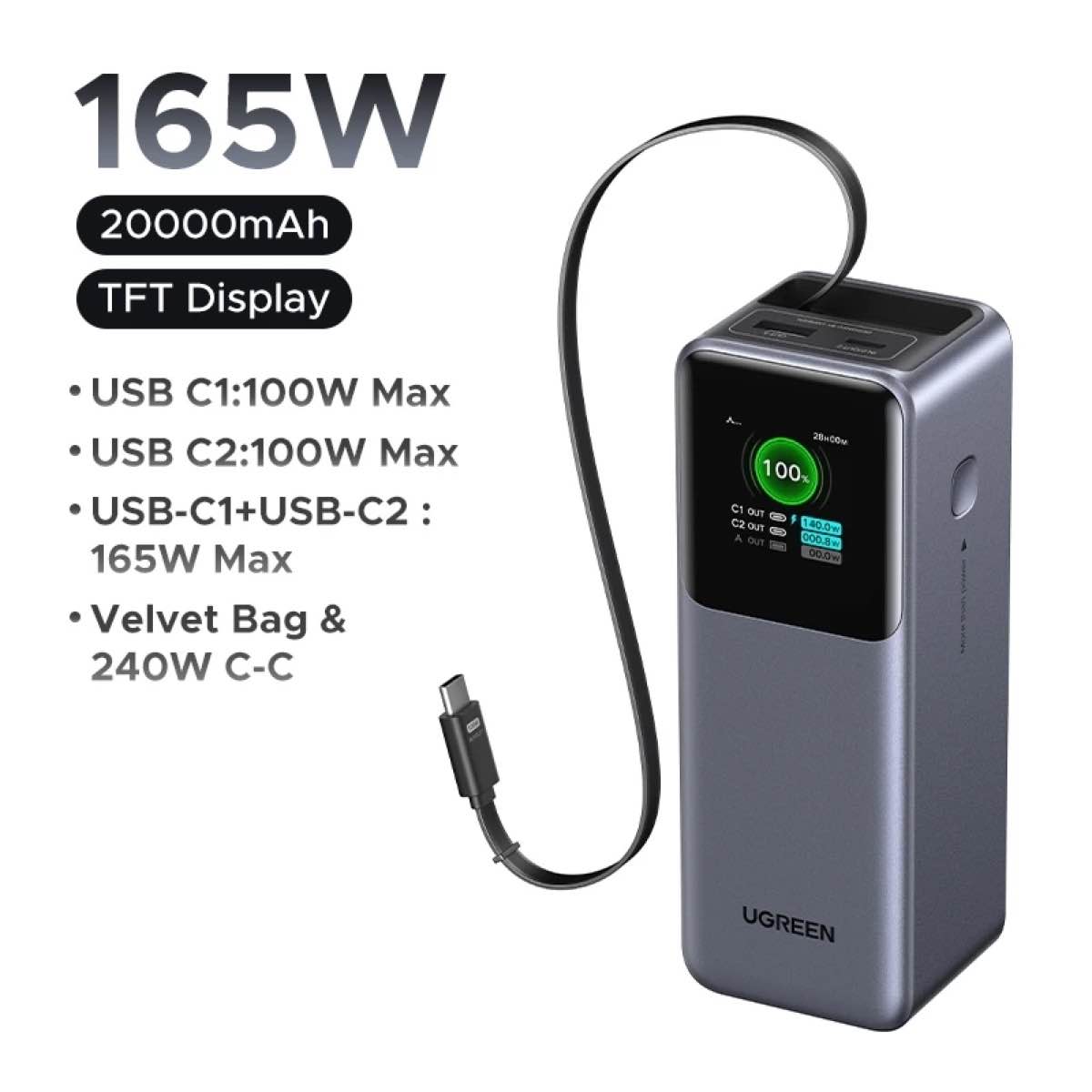 Viên pin có dung lượng 20.000mAh, nằm trong ngưỡng an toàn để mang lên máy bay. Với tổng công suất lên tới 165W (trong đó cổng đơn đạt tối đa 100W), thiết bị dư sức cấp nguồn cho các dòng laptop mỏng nhẹ như MacBook Air, MacBook Pro hay Dell XPS. Thiết kế cáp USB-C dài 65cm với cơ chế rút gọn thông minh giúp bàn làm việc luôn gọn gàng. Khả năng nạp lại năng lượng cũng rất ấn tượng, chỉ mất chưa đầy 2 giờ để đầy pin.