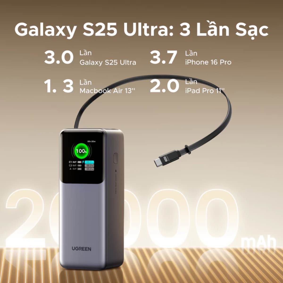 Sở hữu dung lượng khủng 25.000mAh, thiết bị cung cấp năng lượng dư dả cho mọi thiết bị từ điện thoại đến laptop gaming. Điểm “đáng tiền” nhất là việc tích hợp sẵn 2 sợi cáp USB-C dài tới 70cm có nam châm hít gọn gàng. Độ dài này cực kỳ lý tưởng để sạc laptop khi ổ cắm ở xa. Màn hình của sản phẩm này cũng thuộc hàng cao cấp với độ sáng tốt và có thể mang lên máy bay.