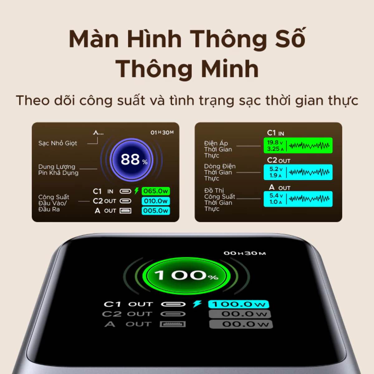 Điểm nhấn của sản phẩm nằm ở màn hình hiển thị thông minh, cung cấp chi tiết các thông số kỹ thuật chuyên sâu như: nhiệt độ pin, thời gian sạc còn lại, độ chai pin và số chu kỳ sạc. Sản phẩm này cũng tích hợp sẵn dây đeo kiêm cáp sạc USB-C rất tiện lợi.