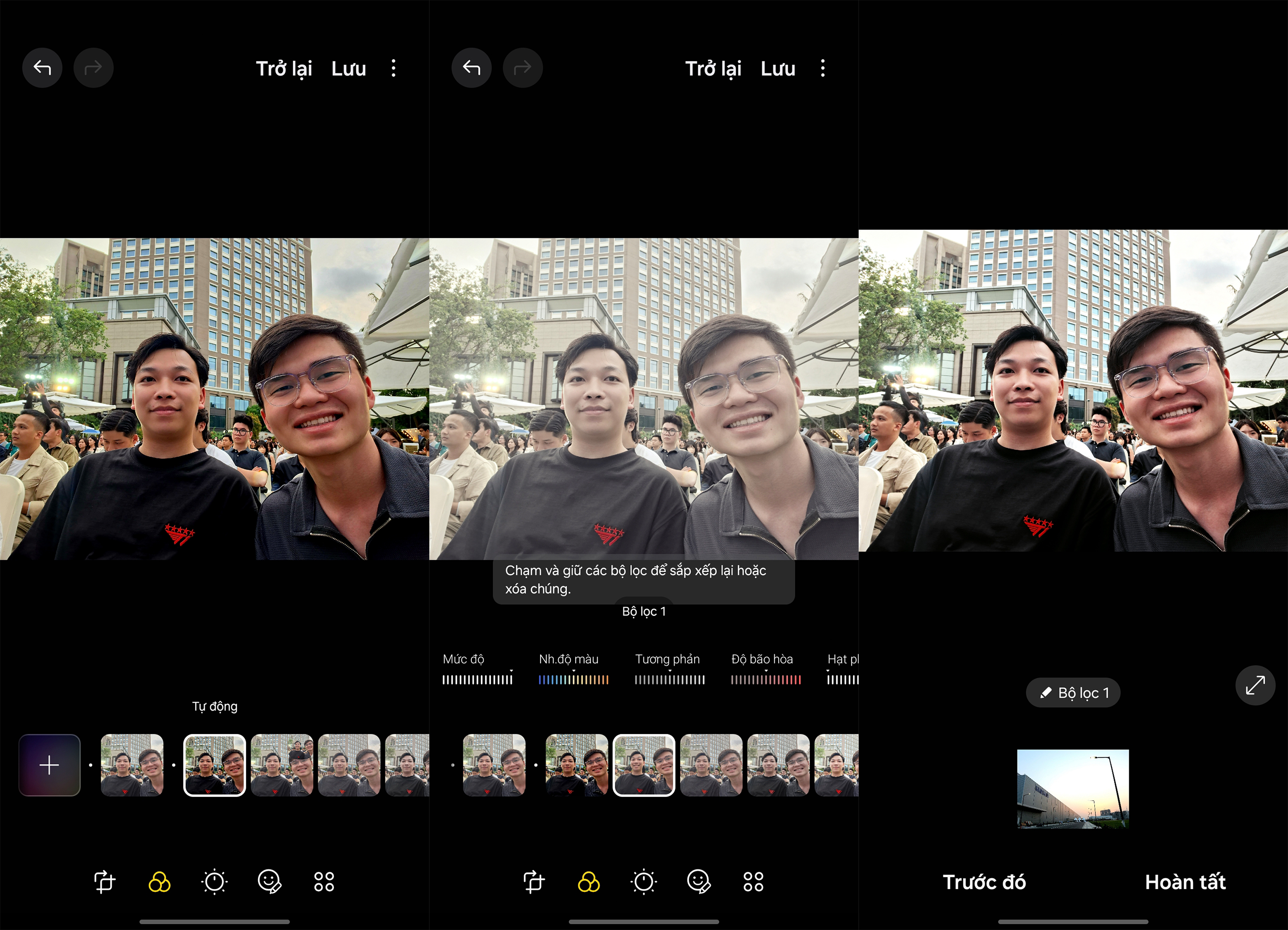 Với các bạn nam không rành về chỉnh sửa ảnh, Gợi ý chỉnh sửa sẽ là trợ thủ đắc lực. Tính năng sẽ tự động phân tích bức ảnh, đề xuất các bộ lọc màu, hiệu ứng, điều chỉnh độ sáng, tương phản… phù hợp, giúp bạn có được bức ảnh ưng ý chỉ với vài thao tác đơn giản.