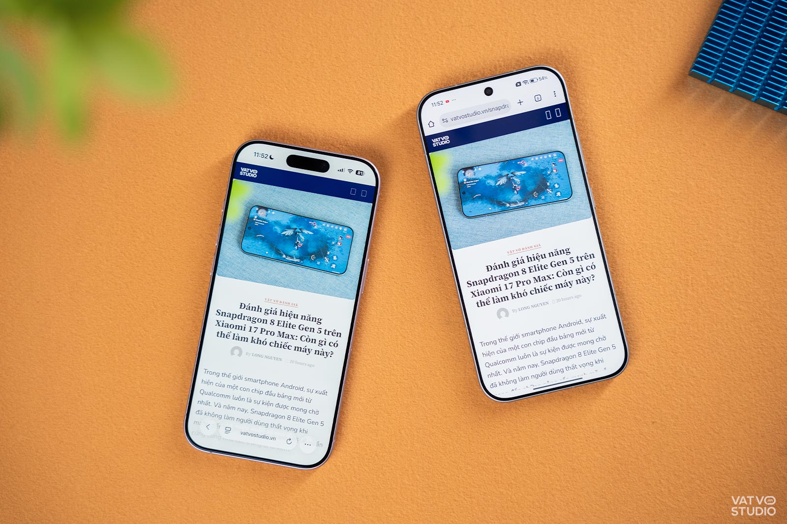 Có lẽ màn hình là yếu tố cân bằng nhất trên cả hai chiếc máy. Xiaomi 17 và iPhone 17 đều được trang bị những tấm nền xuất sắc với kích thước tương đồng 6,3 inch, tần số quét biến thiên 1-120Hz, độ sáng rất cao và viền màn hình siêu mỏng.