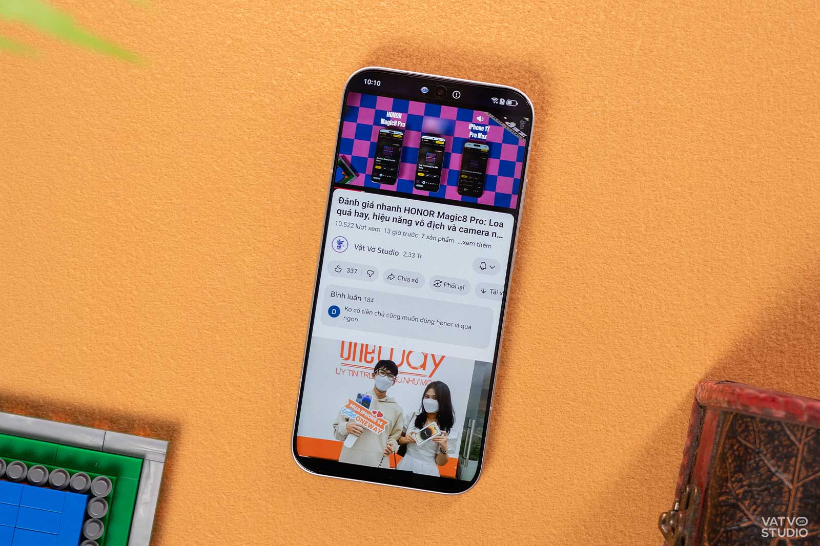 Về màn hình, HONOR Magic8 sở hữu màn hình 6,58 inch, tấm nền LTPO OLED và tần số quét 120Hz. Mẫu máy sử dụng màn hình phẳng hoàn toàn, không phải dạng cong nhẹ bốn bên như phiên bản Pro.