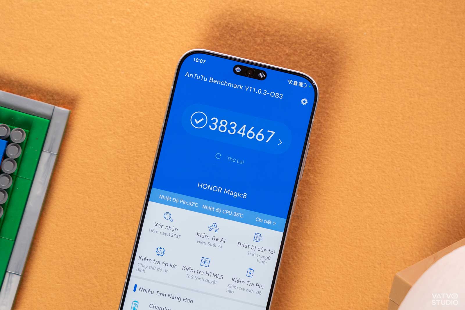 Thử nghiệm nhanh với AnTuTu Benchmark, máy cho kết quả đầu ra ấn tượng với hơn 3,8 triệu điểm. Con số này nhỉnh hơn nhiều so với các mẫu máy Android khác cũng chạy Snapdragon 8 Elite Gen 5, chỉ dao động ở mức từ 3 – 3,5 triệu điểm.