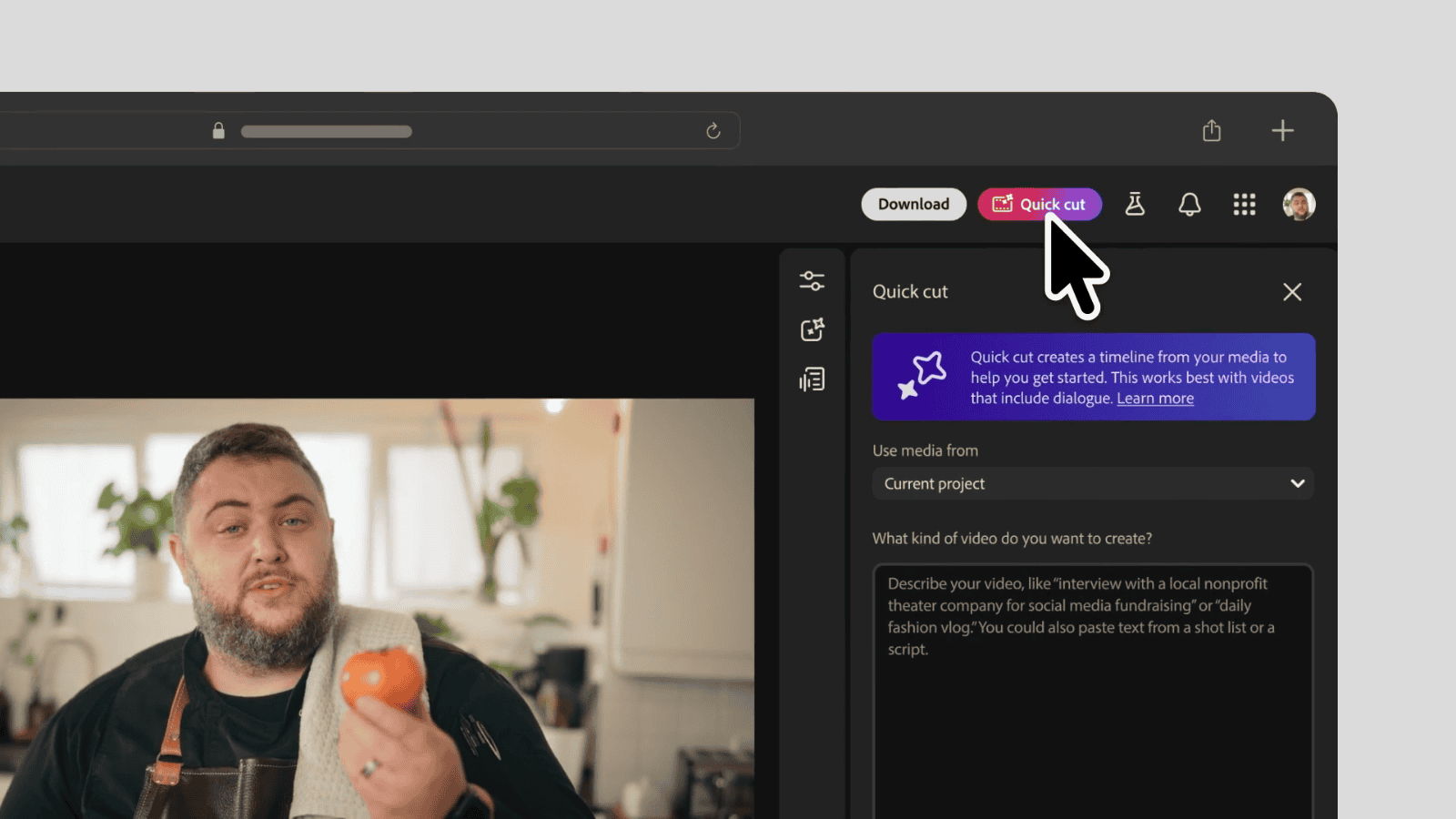 Quick Cut hiện đang được triển khai thử nghiệm trên trình chỉnh sửa video của Adobe Firefly. Tính năng này cho phép người dùng tự động lắp ghép các clip dựa trên mô tả bằng văn bản hoặc các yêu cầu đầu vào đơn giản. Thay vì phải thực hiện thao tác kéo thả thủ công từng đoạn phim lên dòng thời gian, bạn có thể tải lên các cảnh quay phụ của mình hoặc sử dụng video do AI tạo ra để máy tự sắp xếp thành một cấu trúc hoàn chỉnh. Ông Mike Polner, đại diện bộ phận tiếp thị sản phẩm của Adobe, cho biết mục tiêu của công cụ là giúp người biên tập nhanh chóng có được một bản dựng có thể làm việc được ngay thay vì phải đối mặt với một dòng thời gian trống.