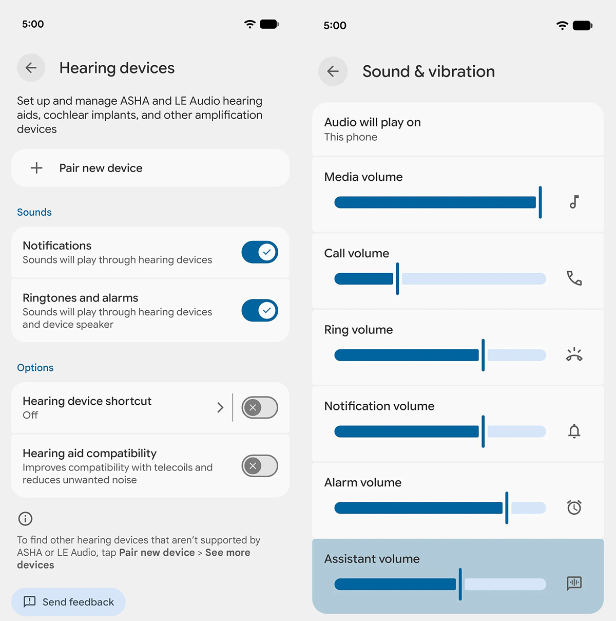 Người dùng có thiết bị trợ thính hiện có thể quản lý độc lập nơi phát các âm thanh hệ thống như thông báo hoặc nhạc chuông. Bạn có thể chọn phát âm thanh qua máy trợ thính đã kết nối hoặc qua loa ngoài của điện thoại. Ngoài ra bản cập nhật còn bổ sung thanh trượt âm lượng Assistant riêng biệt để điều chỉnh mức âm thanh của trợ lý độc lập với âm lượng phương tiện.