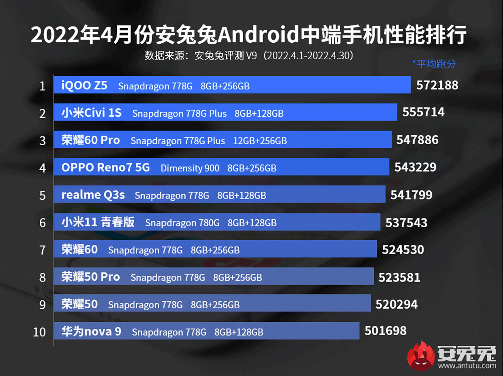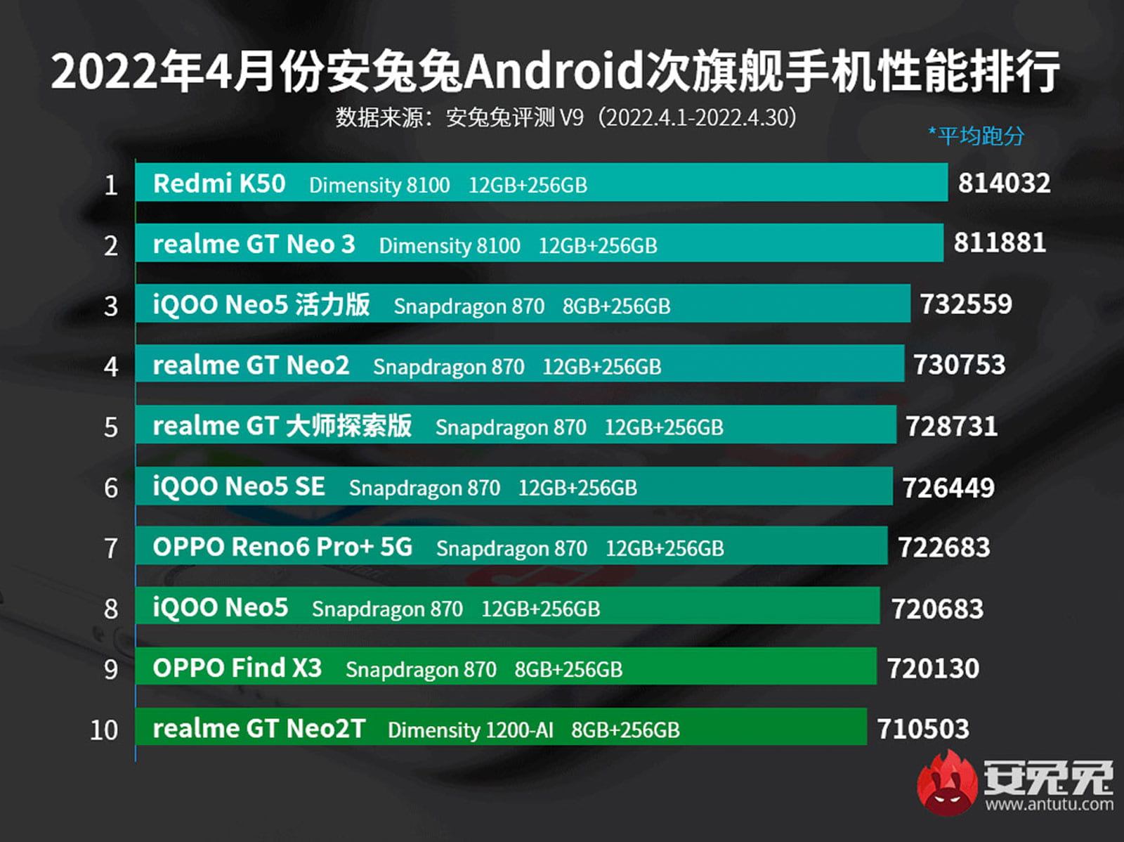 Mới đây, nền tảng benchmark Antutu đã công bố danh sách những chiếc điện thoại Android có hiệu năng tốt nhất trong tháng 4 vừa qua. Nhằm đảm bảo tính khác quan, bảng xếp hạng dưới đây của AnTuTu sẽ tính điểm trung bình chứ không phải điểm cao nhất trong mỗi lần đo. Thời gian thu thập dữ liệu là từ ngày 1/4/2022 đến ngày 30/4/2022 trong thị trường nội địa Trung Quốc.