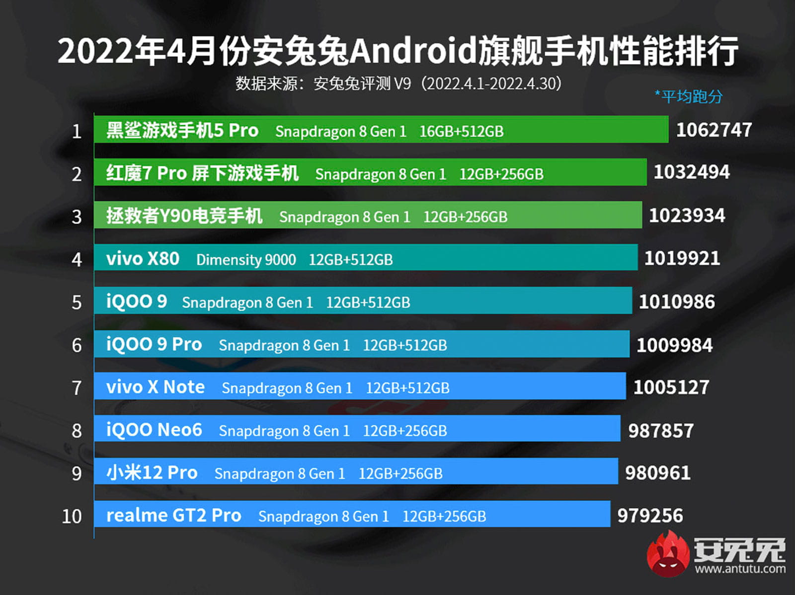 Trong bảng xếp hạng lần này, sự thống trị của vi xử lý Snapdragon 8 Gen 1 tiếp tục được duy trì. Đứng đầu danh sách là chiếc Black Shark 5 Pro với số điểm 1.062.747. Nubia Red Magic 7 và Lenovo Legion Y90 lần lượt xếp ở các vị trí tiếp theo. Từ vị trí thứ 5 đến thứ 10, các thiết bị sử dụng vi xử lý hàng đầu hiện tại của Qualcomm lần lượt gồm:  iQOO 9, iQOO 9 Pro, Vivo X Note, iQOO Neo6, Xiaomi 12 Pro và Realme GT 2 Pro. Điểm đáng chú ý nhất trong danh sách lần này, chính là sự hiện diện của Vivo X80 ở vị trí thứ 4 với con chip Dimensity 9000.