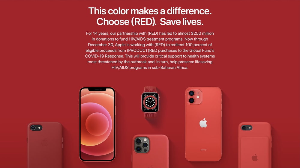 Hiện tại Apple mở bán nhiều sản phẩm PRODUCT(RED) như iPhone 12, 12 mini màu đỏ, Apple Watch Series 6 màu đỏ, số lượng lớn phụ kiện như ốp silicon, da MagSafe, dây đeo Apple Watch màu đỏ. Từ giờ cho tới 30 tháng 12, mọi doanh thu thu được khi bán sản phẩm này sẽ được ủng hộ hết.