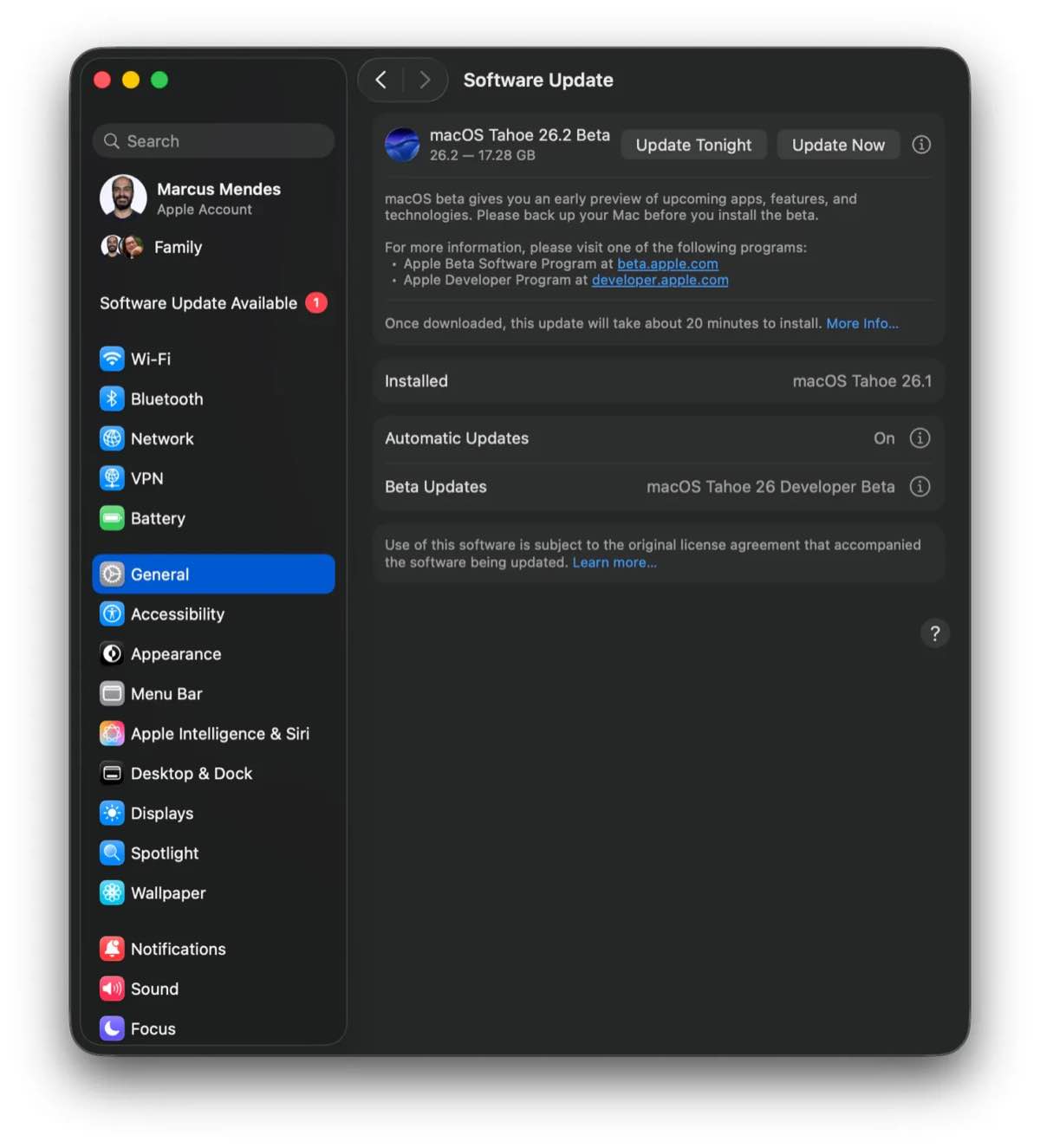 Đối với những người dùng muốn trải nghiệm sớm phiên bản này, quy trình cài đặt có thể thực hiện ngay trong phần Cài đặt hệ thống. Trước tiên, người dùng cần sao lưu dữ liệu máy Mac để đảm bảo an toàn. Sau đó, hãy truy cập vào Cài đặt chung và chọn mục Cập nhật phần mềm. Tại giao diện này, người dùng cần nhấp vào biểu tượng chữ “i” nằm cạnh mục Beta Updates. Tùy thuộc vào việc bạn là nhà phát triển hay người dùng công chúng đã đăng ký tại trang web beta của Apple, hãy chọn “macOS Developer Tahoe Beta” hoặc “macOS Tahoe 26 Public Beta” từ menu thả xuống, sau đó nhấn Xong để hệ thống bắt đầu tải về bản cập nhật.
