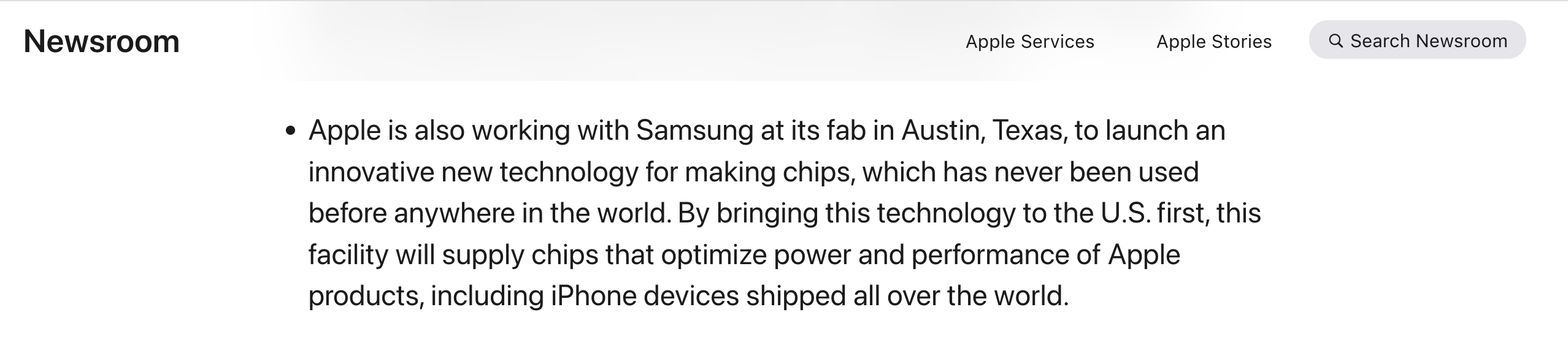 Cụ thể, trong một thông báo về việc tăng cường sản xuất tại Mỹ, Apple đã hé lộ về một thỏa thuận quan trọng nhưng không nêu chi tiết. Hãng cho biết đang làm việc với Samsung tại nhà máy ở Austin, Texas để ra mắt một “công nghệ mới đột phá trong việc sản xuất chip, vốn chưa từng được sử dụng ở bất kỳ đâu trên thế giới”.