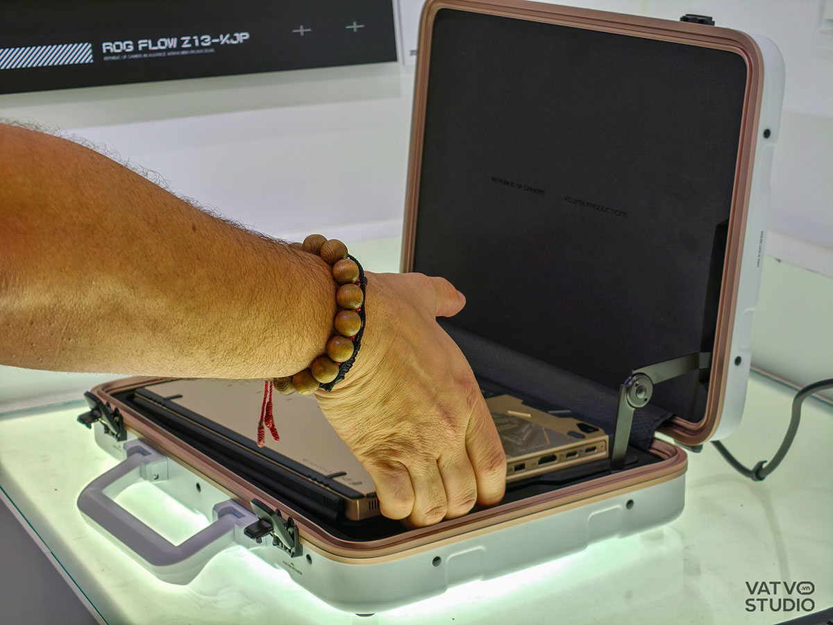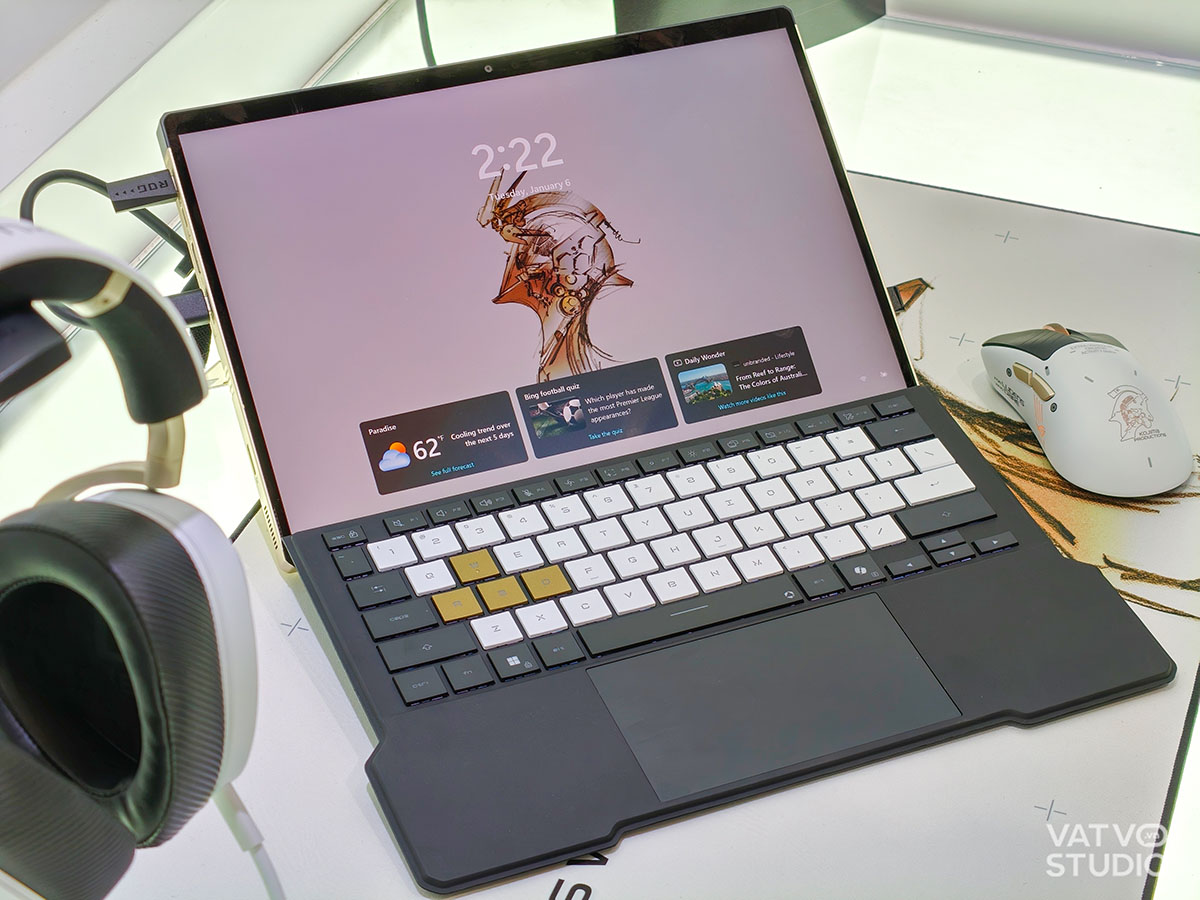 Điểm nhấn độc đáo khác nằm ở bộ phụ kiện đi kèm, bao gồm một chiếc vali vận chuyển mô phỏng các thùng hàng đặc trưng của nhân vật Sam Bridges. Chiếc vali này có tông màu trắng với viền đồng và được in dòng chữ mô tả đầy kiêu hãnh: “Thiết bị Hoạt động Sáng tạo Ngoại vi”. Bên cạnh đó, ASUS cũng thay đổi thiết kế của bàn phím tháo rời với layout phím nhiều màu sắc và các phím chức năng màu vàng nổi bật để đồng bộ với thân máy.
