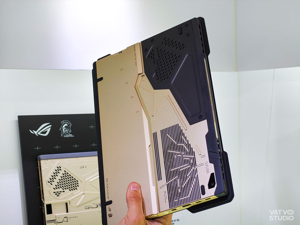 Diện mạo của ROG Flow Z13-KJP được nhào nặn dưới bàn tay của Yoji Shinkawa, giám đốc nghệ thuật kiêm thiết kế cơ khí của series Death Stranding. Toàn bộ thân máy là sự kết hợp giữa tông màu đen và vàng kim, mang đậm phong cách quân đội và thực dụng. Mặt sau của thiết bị sử dụng vật liệu sợi carbon với các đường viền cắt xẻ tỉ mỉ quanh khe tản nhiệt, đi kèm các dòng chữ cảnh báo nhỏ như trên các thiết bị chuyên dụng trong game.