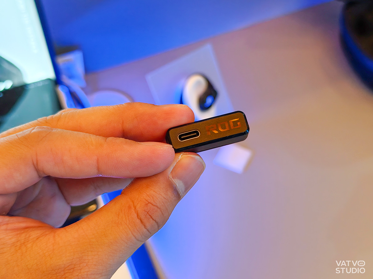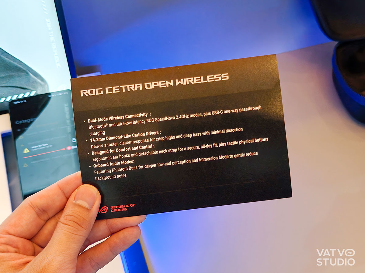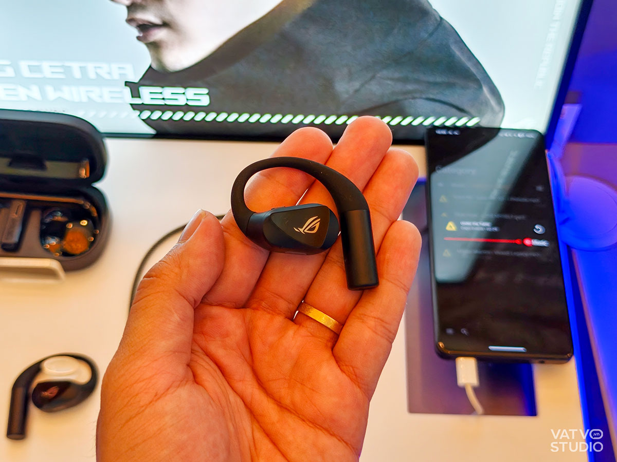 Điểm nhấn đáng chú ý nhất trong bộ sưu tập này là mẫu tai nghe ROG Cetra Open Wireless. Qua ảnh thực tế, có thể thấy sản phẩm sở hữu thiết kế dạng móc vành tai (earhook) công thái học rất phong cách với logo ROG đặc trưng của hãng. Thiết bị này không chỉ dừng lại ở một chiếc tai nghe thời trang mà còn được trang bị công nghệ kết nối không dây chế độ kép, bao gồm Bluetooth và kết nối 2.4GHz thông qua bộ dongle ROG SpeedNova đi kèm. Việc trang bị dongle riêng biệt giúp giảm thiểu độ trễ đến mức cực thấp.