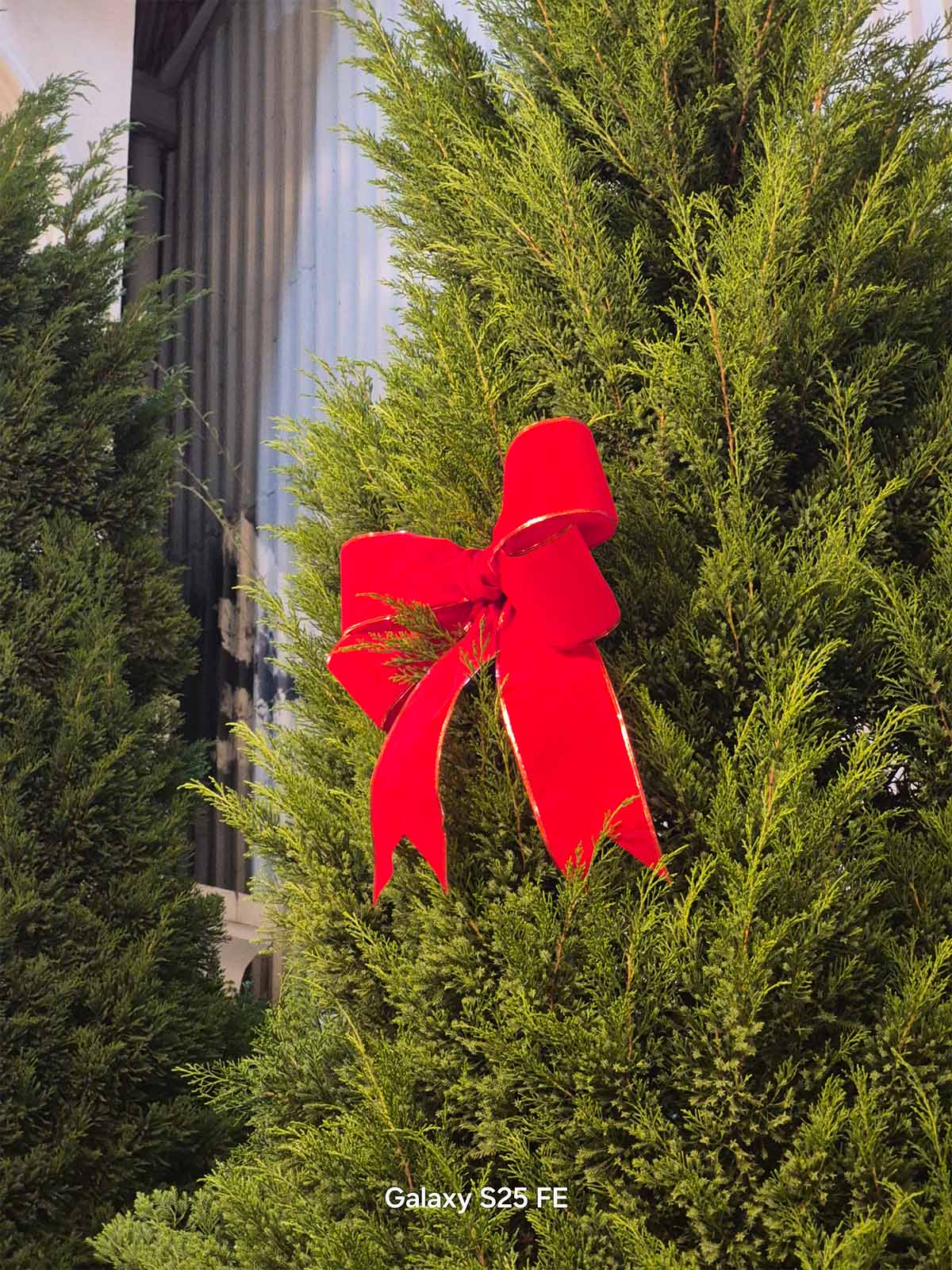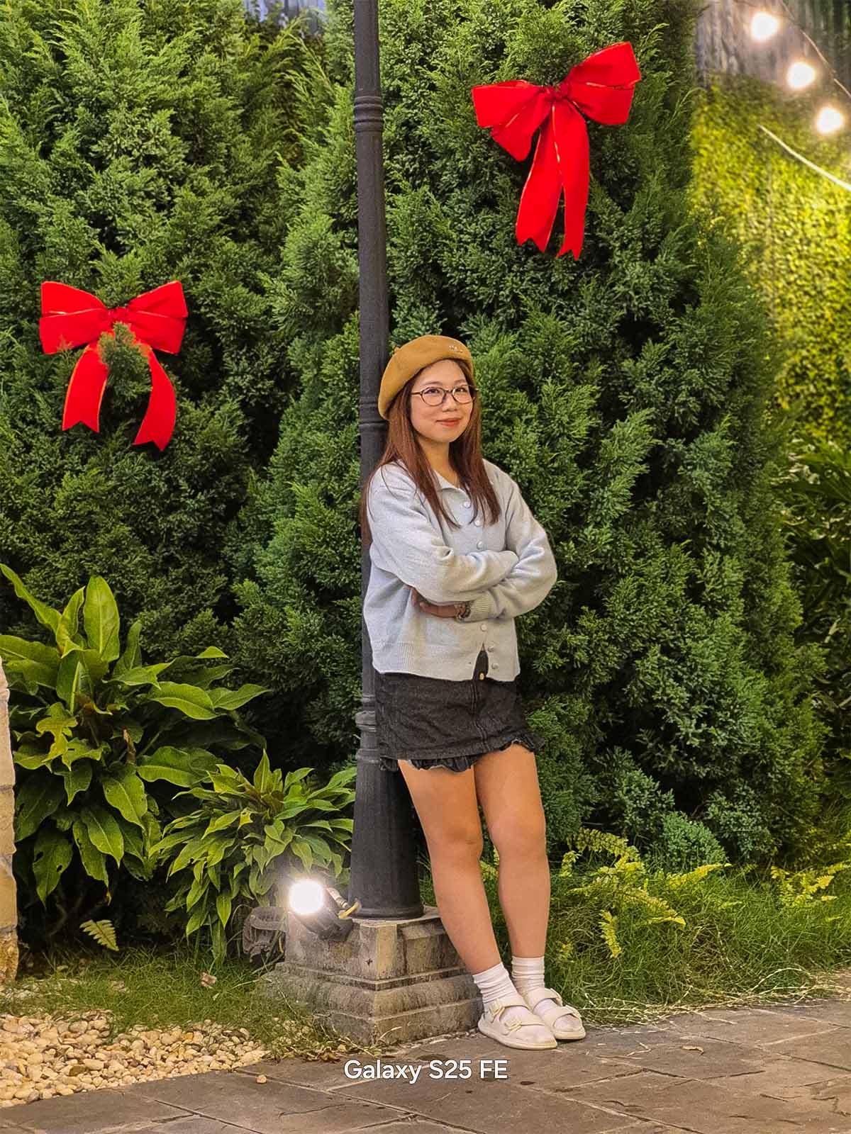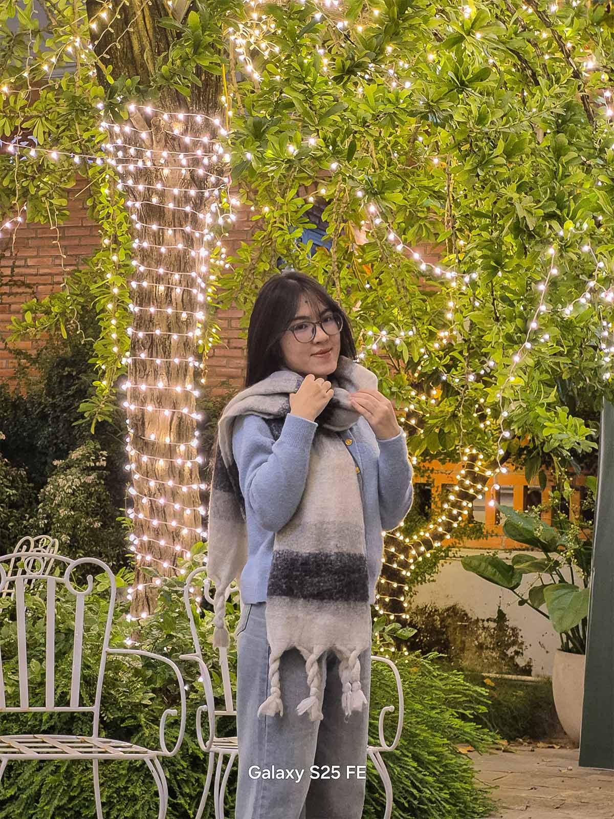 Một trong những thói quen phổ biến của các bạn trẻ khi đi chơi Noel là chụp ảnh chân dung check-in bên cạnh những cây thông hay các tiểu cảnh trang trí. Thông thường, camera góc rộng (1x) sẽ thu quá nhiều chi tiết thừa xung quanh, khiến chủ thể bị lọt thỏm giữa đám đông. Đây là lúc khả năng zoom linh hoạt trên Galaxy S25 FE tỏa sáng.