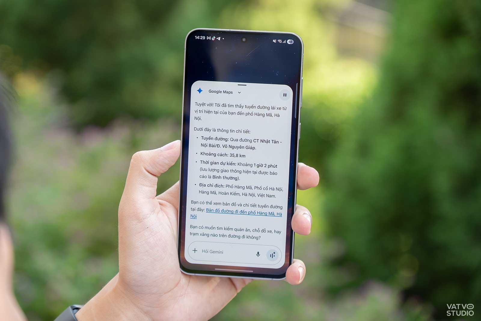 Các bạn trẻ chỉ cần nhấn giữ phím nguồn trên Galaxy S25 FE để kích hoạt trợ lý ảo, và đặt một câu hỏi tự nhiên: “Đêm nay tôi muốn đi chơi Noel quanh khu vực Nhà thờ Lớn. Bạn gợi ý cho tôi các quán cà phê có trang trí Giáng sinh đẹp, view nhìn ra nhà thờ nhưng nằm trong ngõ yên tĩnh một chút nhé”. Ngay lập tức, Gemini sẽ đưa ra danh sách chi tiết các hàng quán phù hợp với tiêu chí đưa ra, đi kèm với các lưu ý.