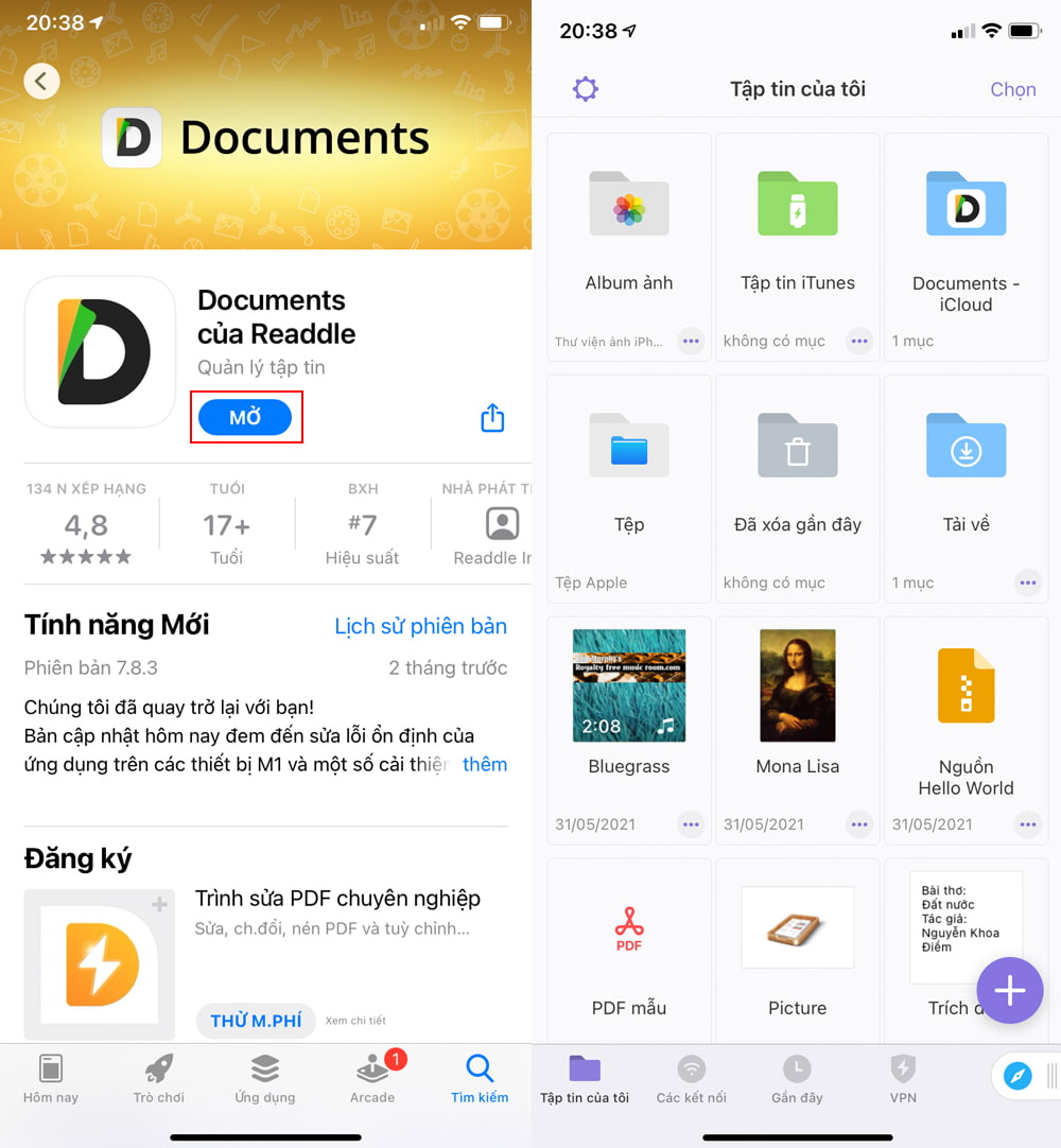 • Bước 2: Truy cập App Store tải ứng dụng Documents tại đây, mở ứng dụng Documents, chọn biểu tượng trình duyệt ở góc phải phía dưới màn hình.