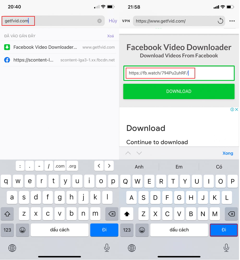 • Bước 3: Nhập vào thanh tìm kiếm trang web Getfvid.com, dán Link video cần tải vào mục Enter Facbook Video URL… sau đó bấm Enter trên bàn phím.
