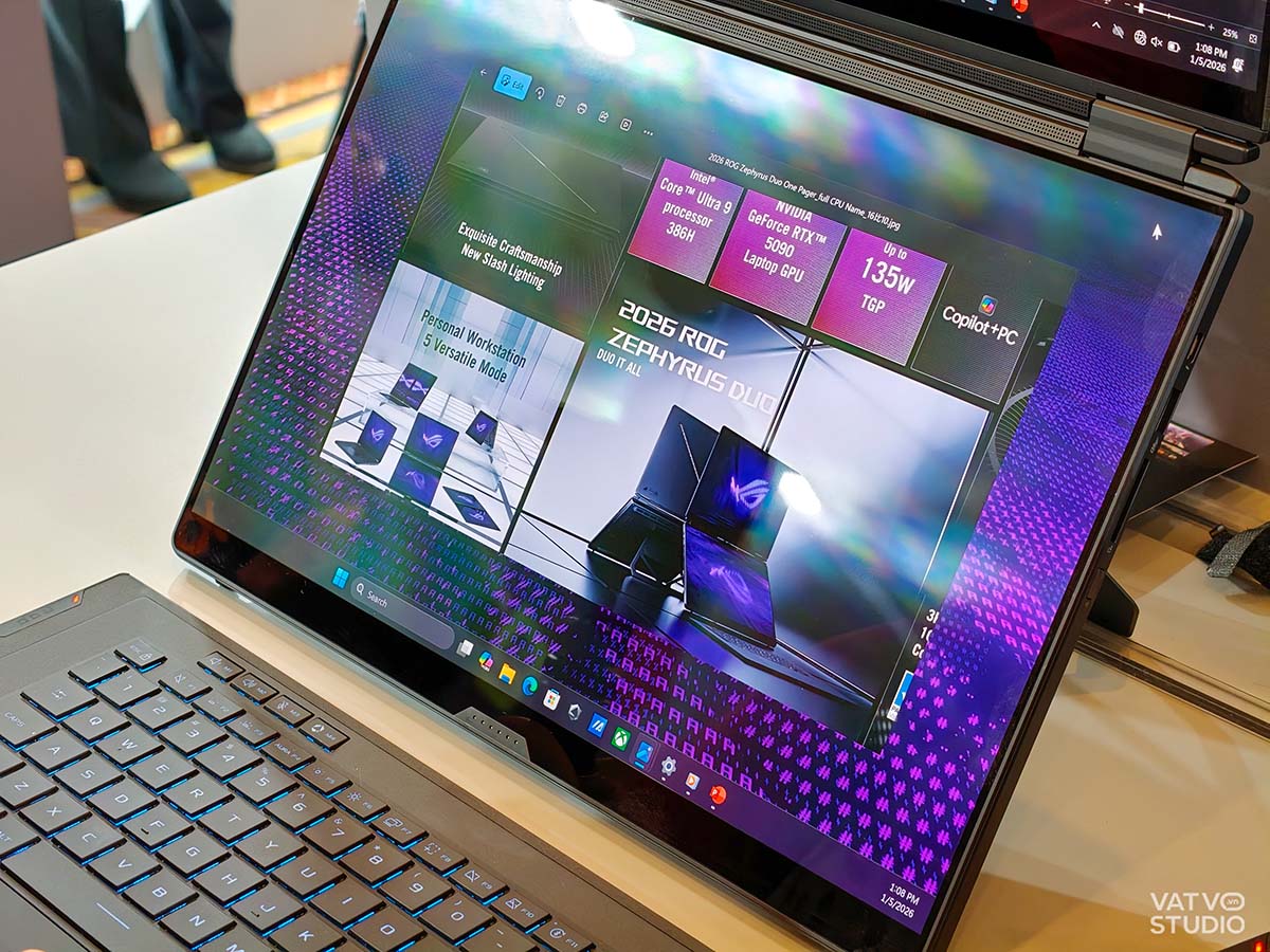 Tại triển lãm CES 2026, ASUS gây ấn tượng mạnh khi trình làng mẫu ROG Zephyrus Duo sở hữu thiết kế hai màn hình OLED 16 inch tràn viền độc đáo. Không chỉ mang sức mạnh đột phá từ card đồ họa RTX 5090, thiết bị còn tối ưu hóa trải nghiệm người dùng nhờ bàn phím tháo rời linh hoạt. Đây là bước đi đầy tham vọng của hãng công nghệ Đài Loan trong việc kế thừa thành công từ dòng ZenBook Duo, nhằm chinh phục những tiêu chuẩn khắt khe nhất của các game thủ.