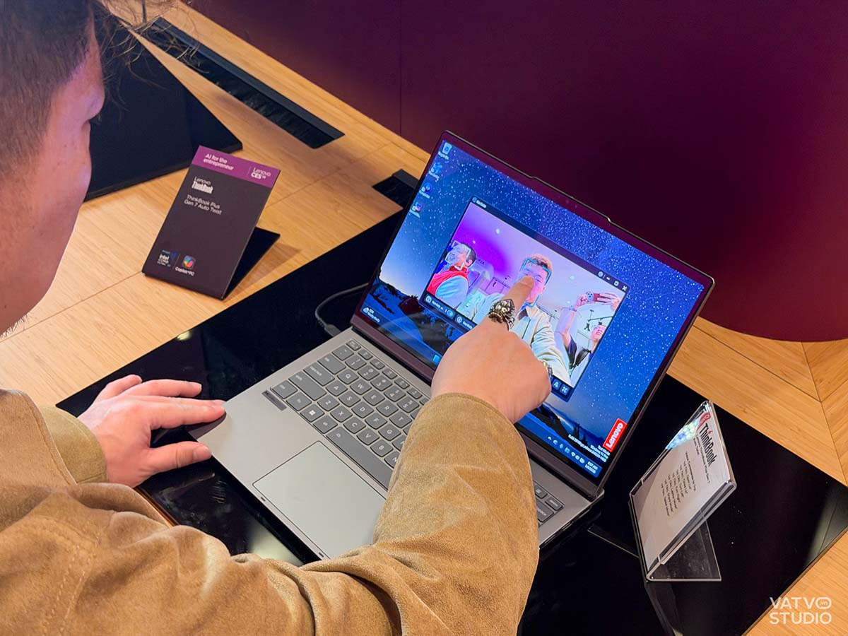 Bên cạnh các tính năng Copilot+ của Microsoft, Lenovo còn tích hợp trợ lý AI riêng có khả năng phản hồi trực quan và thực hiện các tác vụ dịch thuật hoặc phân tích ẩn ý ngôn ngữ. Các hình ảnh trải nghiệm thực tế cho thấy giao diện ứng dụng camera của máy tích hợp sâu các công cụ AI để tối ưu hóa hình ảnh và theo dõi cử động của người dùng trong thời gian thực.