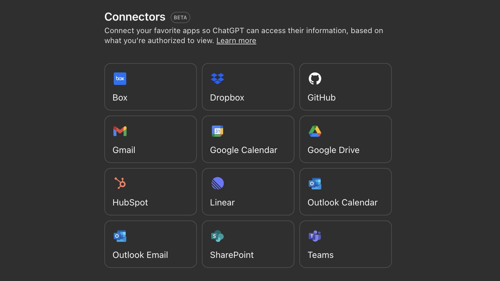 OpenAI vừa công bố một bản cập nhật quan trọng cho ChatGPT với tính năng Connectors, cho phép tích hợp liền mạch với các nền tảng doanh nghiệp phổ biến như Gmail, Microsoft Teams, Outlook, Google Drive, GitHub, Dropbox, Box, SharePoint và OneDrive. Đây là một bước tiến chiến lược, khẳng định vị thế của ChatGPT như một công cụ AI toàn diện cho doanh nghiệp.