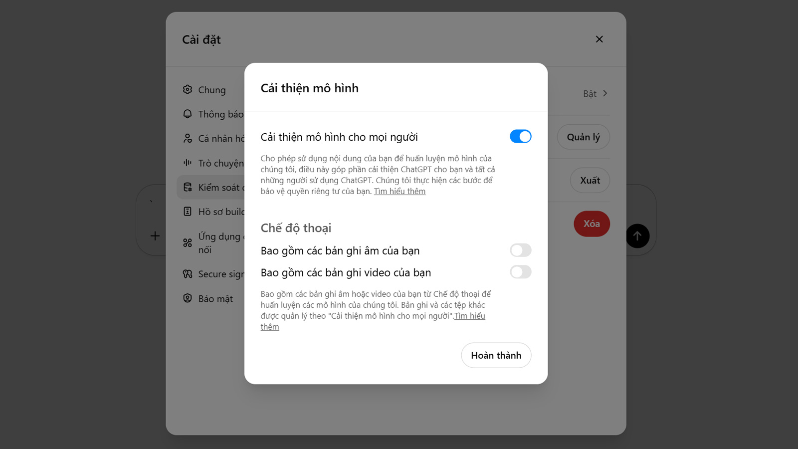 Về bảo mật, OpenAI áp dụng chiến lược nhiều lớp. Đối với các gói Enterprise, Team và Edu, dữ liệu được kết nối sẽ không bị sử dụng để huấn luyện mô hình, đảm bảo tính bảo mật cho thông tin doanh nghiệp. Người dùng Plus và Pro cần kiểm tra lại cài đặt “Cải thiện mô hình cho mọi người” để tránh nguy cơ rò rỉ dữ liệu không mong muốn.