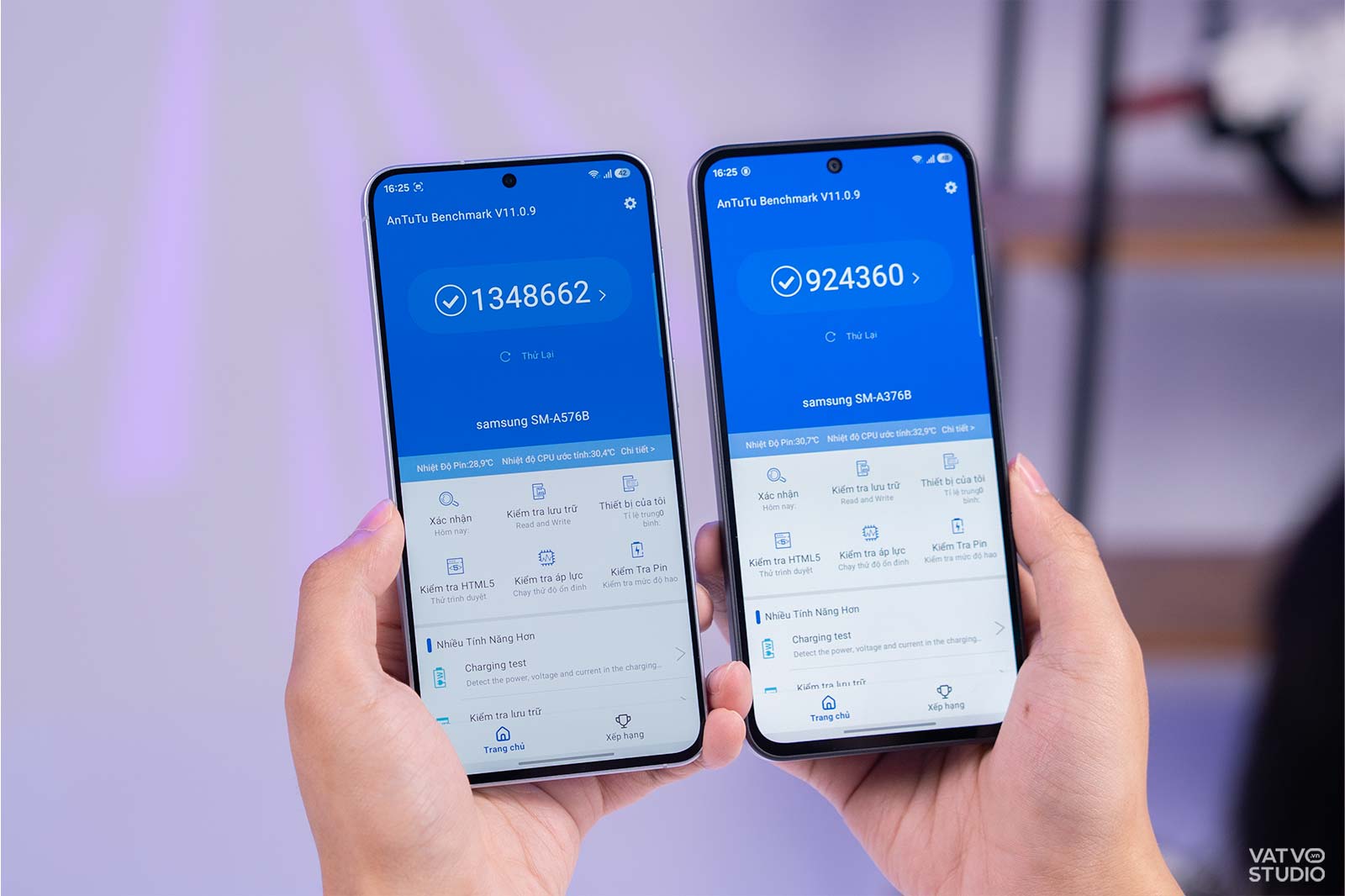 Trong khi đó, Galaxy A57 5G sở hữu Exynos 1680 thế hệ mới nhất, được xây dựng trên tiến trình 4nm của Samsung. Việc nâng cấp vi xử lý giúp Galaxy A57 5G tối ưu hóa tốt hơn, mang lại hiệu năng ổn định trong phân khúc giá. Thiết bị hoàn toàn đáp ứng tốt nhu cầu chơi game mạnh mẽ cũng như sử dụng mượt mà trong thời gian dài.