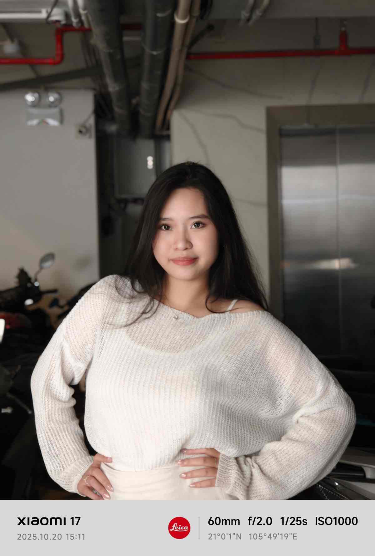 Chuyển sang điều kiện thiếu sáng, mình tiếp tục thử nghiệm máy với các điều kiện khác nhau. Ở môi trường trong hầm gửi xe, vivo X300 cho độ sáng tổng thể cao hơn, đặc biệt là vùng da mặt của mẫu sáng và rõ hơn. Xiaomi 17 do đặc tính tương phản cao của Leica nên ảnh nhìn “sắc” và cá tính hơn nhưng mặt mẫu sẽ hơi tối.