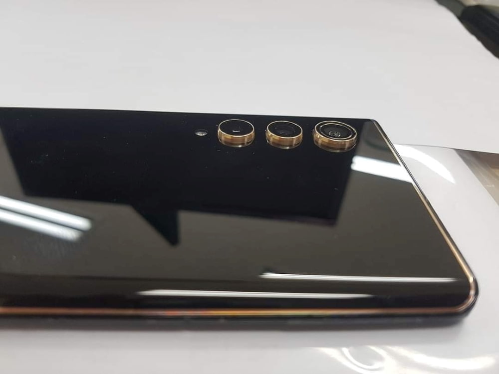 Phần viền camera cũng như cạnh viền máy được làm sáng bóng với các chi tiết được mạ vàng trên tông đen mang lại vẻ sang trọng.