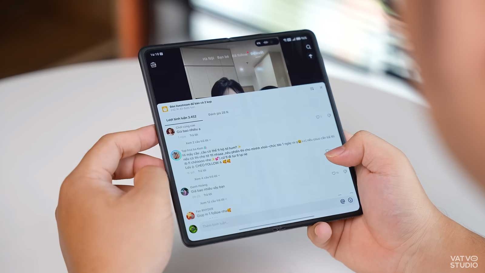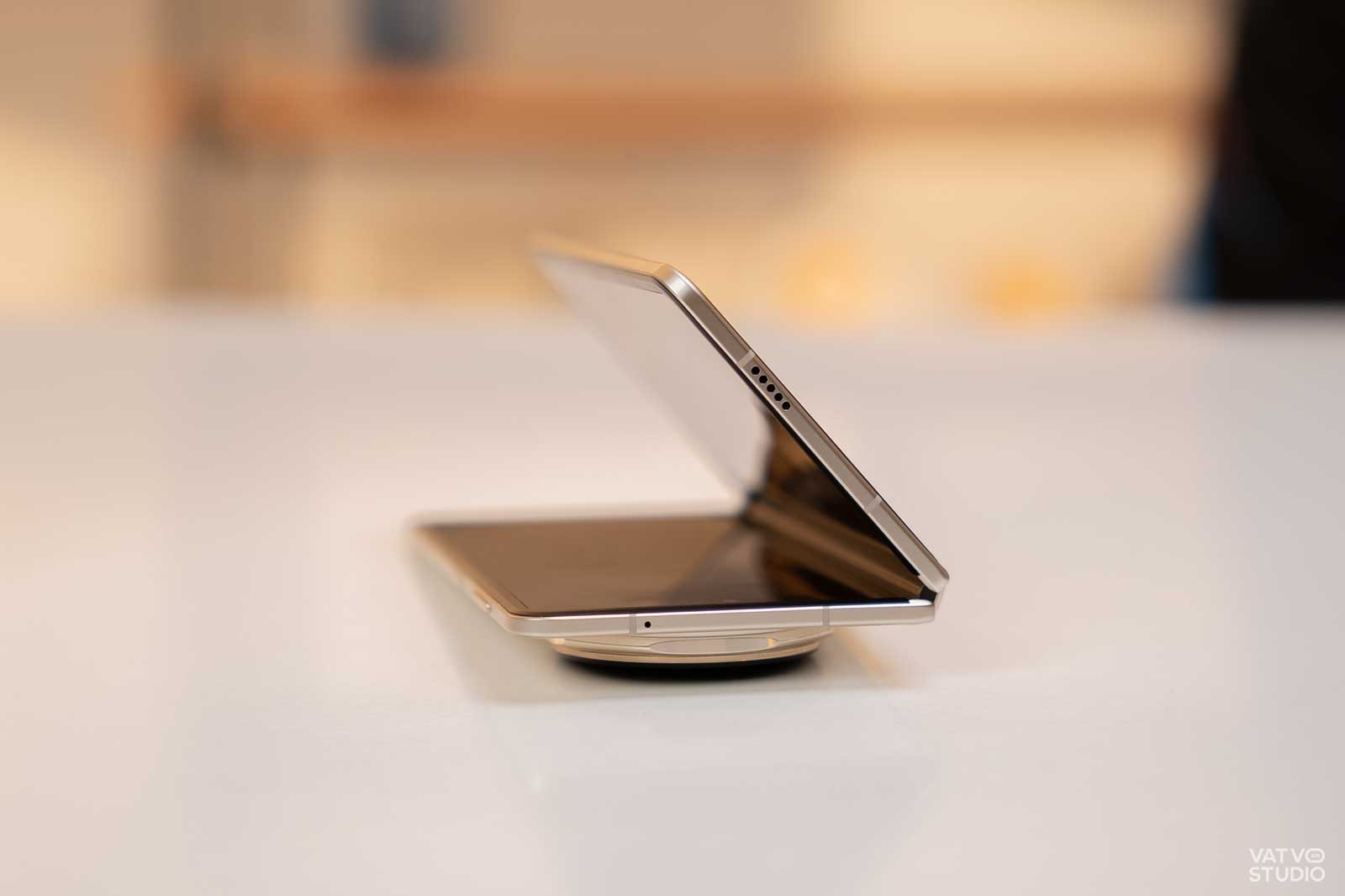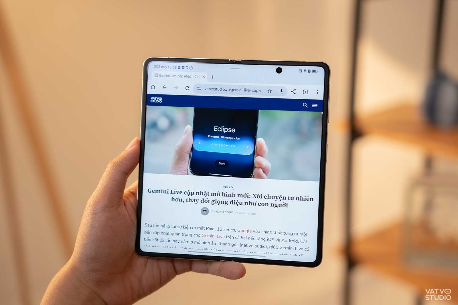 Đổi lại, các góc mở của máy sẽ không đa dạng bằng. Máy không thể cố định ở các góc thấp (như 45 độ hay 75 độ) một cách vững chãi. Trước đây, khi sử dụng Galaxy Z Fold7, mình hay có thói quen mở máy ở góc khoảng 45 độ, xong đặt lên bàn để vừa ăn vừa xem YouTube, bản lề khi này hoạt động như một cái “kickstand” (chân đế) tích hợp. Nhưng với HONOR Magic V5, mình không thể làm được điều đó; mở máy ở góc 45 độ là nó sẽ tự động gập lại.