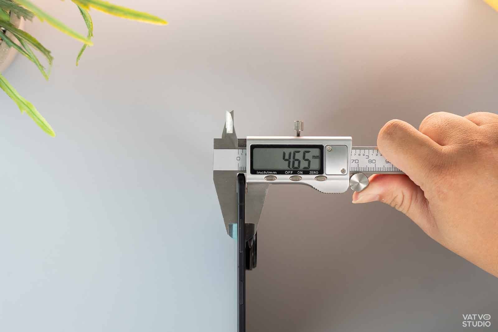 Theo thông số, HONOR Magic V5 có độ mỏng thấp nhất chỉ 4,1 mm khi mở ra, và 8,8 mm khi gập vào. Tuy nhiên, đây chỉ là thông số trên giấy tờ. Mình đã thử nghiệm dùng thước đo điện tử chuyên dụng để đo độ mỏng thực tế của máy, và cũng có so sánh với Galaxy Z Fold7 và OPPO Find N5.
