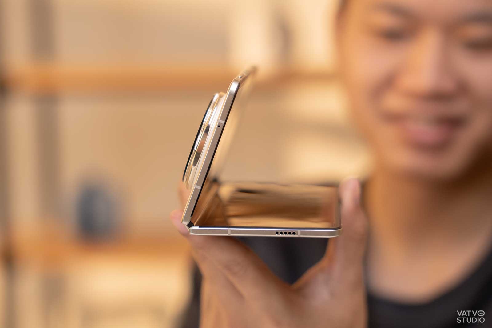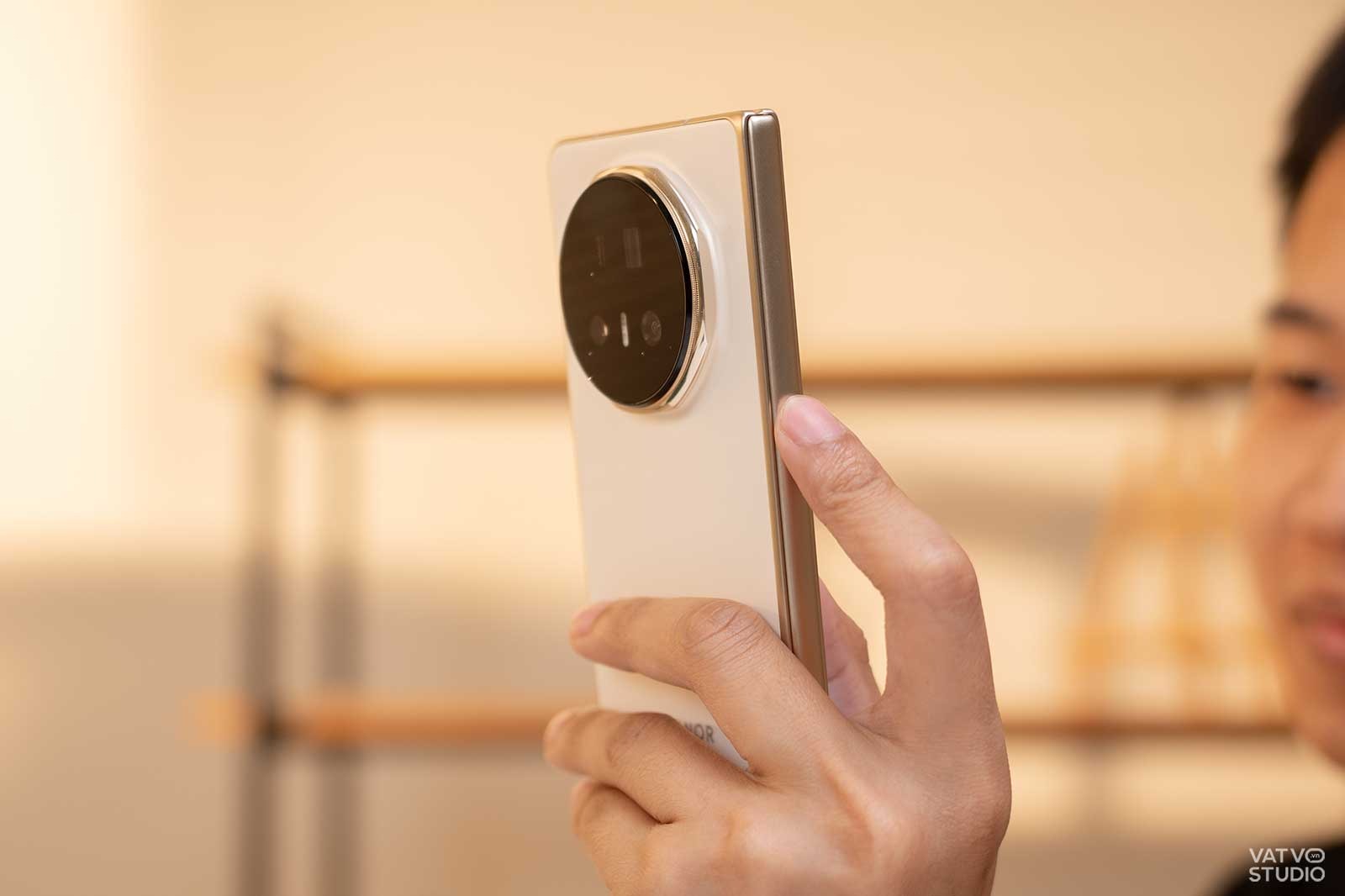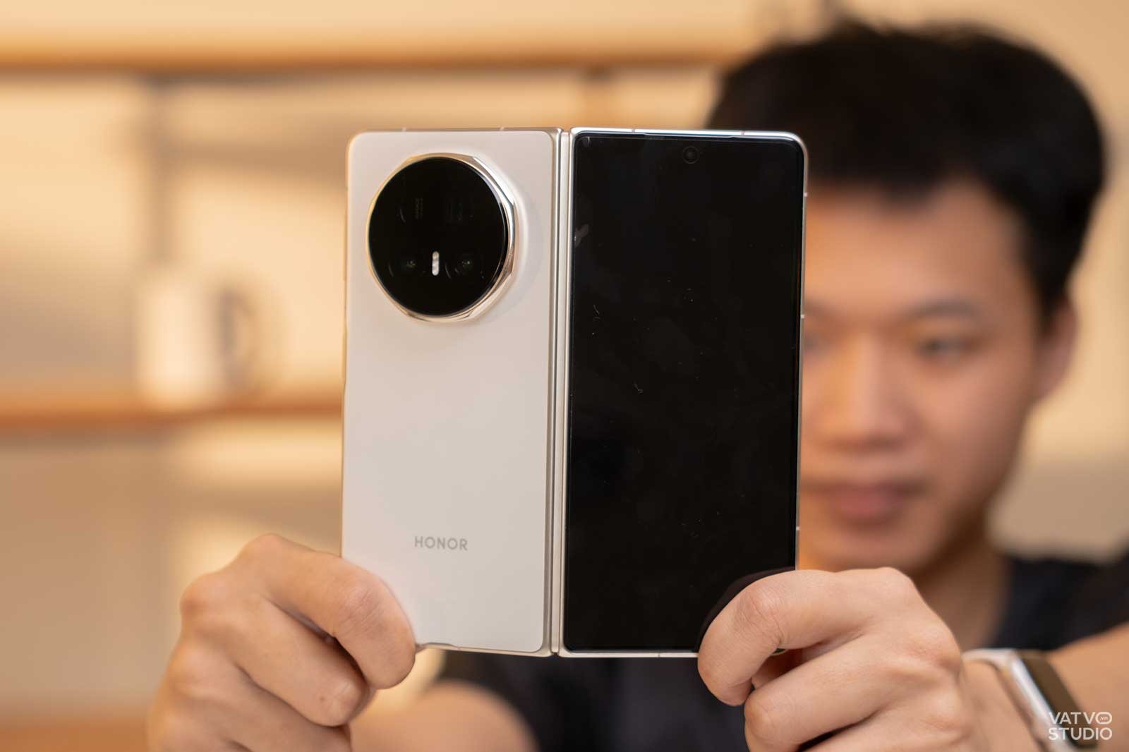 Bù lại, cảm giác cầm nắm mà HONOR Magic V5 vẫn rất ấn tượng, nhẹ nhàng, thanh thoát và không tạo cảm giác rằng mình đang dùng một chiếc máy gập cồng kềnh. Cụm camera sau mặc dù lồi lên khá rõ, song nhờ việc đặt ở chính giữa sẽ giúp máy đỡ bị cập kênh hơn khi đặt trên mặt phẳng.