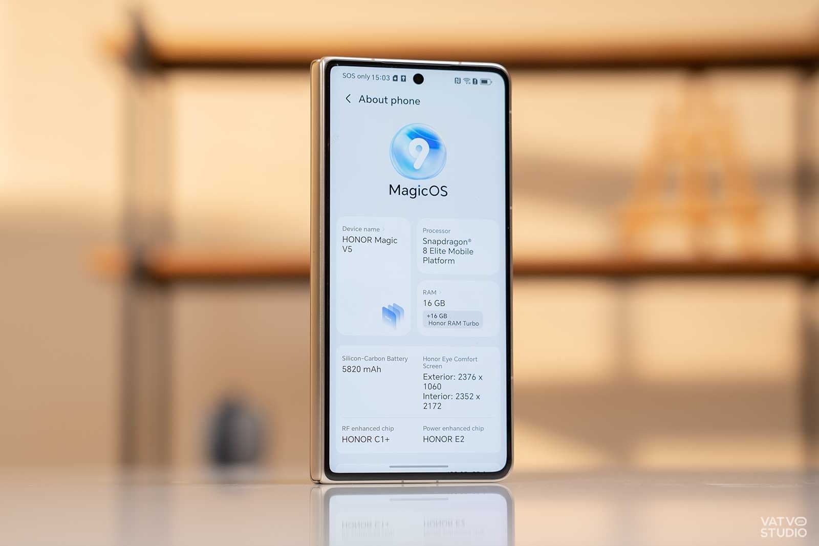 Một yếu tố khác cũng rất quan trọng trên một mẫu máy gập dạng quyển sổ là phần mềm. Trước hết, HONOR Magic V5 được cài đặt sẵn Android 15 cùng giao diện MagicOS 9. Đáng tiếc là máy chưa có sẵn Android 16 ngay khi xuất xưởng như Galaxy Z Fold7.