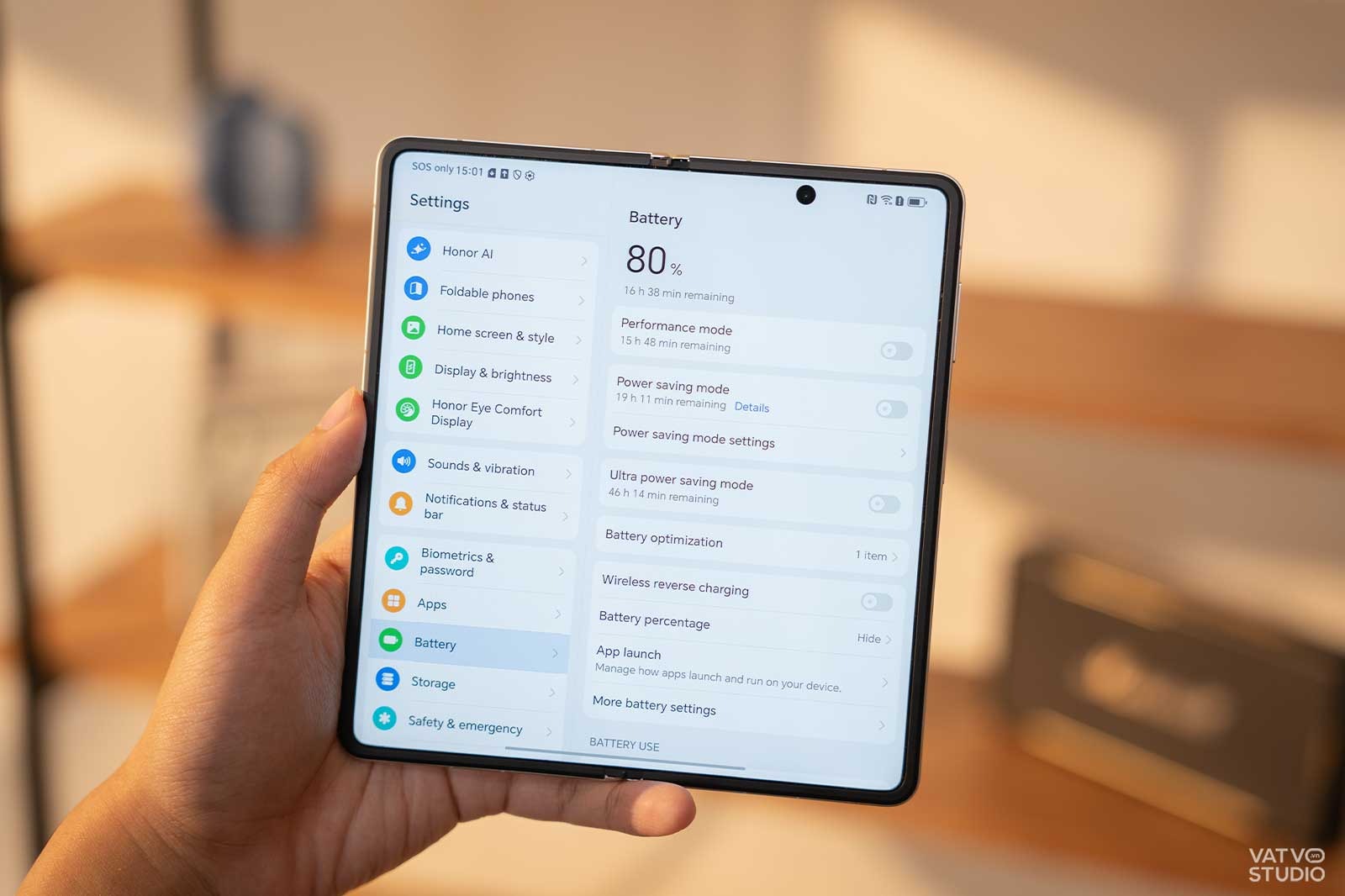 Tuy nhiên, thời gian sử dụng thực tế của HONOR Magic V5 lại chưa quá ấn tượng. Khi sử dụng cùng một lượng tác vụ giống nhau, máy sẽ đạt 7 giờ 12 phút. Con số này chỉ nhỉnh hơn 20 phút so với Galaxy Z Fold7, và thậm chí kém hơn 4 phút so với OPPO Find N5, mặc dù có dung lượng pin cao hơn.