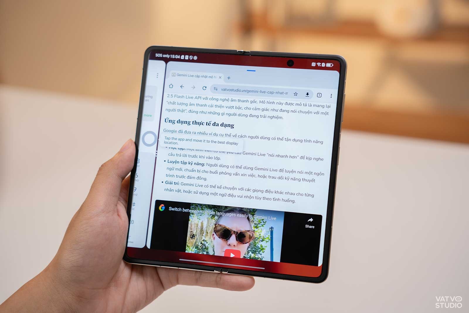 Khi chia 2 ứng dụng, máy cho phép thay đổi tỷ lệ 90:10. Đây là một tính năng mà phải lên Android 16, Google mới trang bị mặc định, nhưng với Android 15 thì HONOR đã tích hợp sẵn. Còn khi chia 3 ứng dụng, người dùng cũng có thể bấm và chuyển đổi hiển thị giữa các ứng dụng một cách linh hoạt, tương tự như trên các dòng OPPO Find.