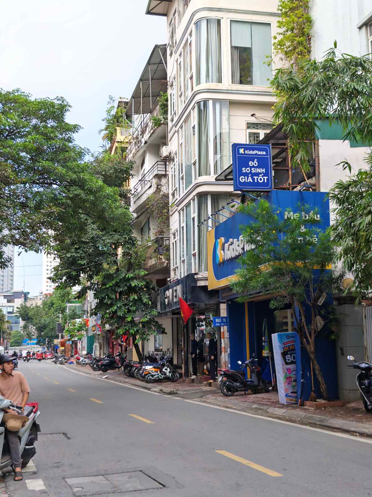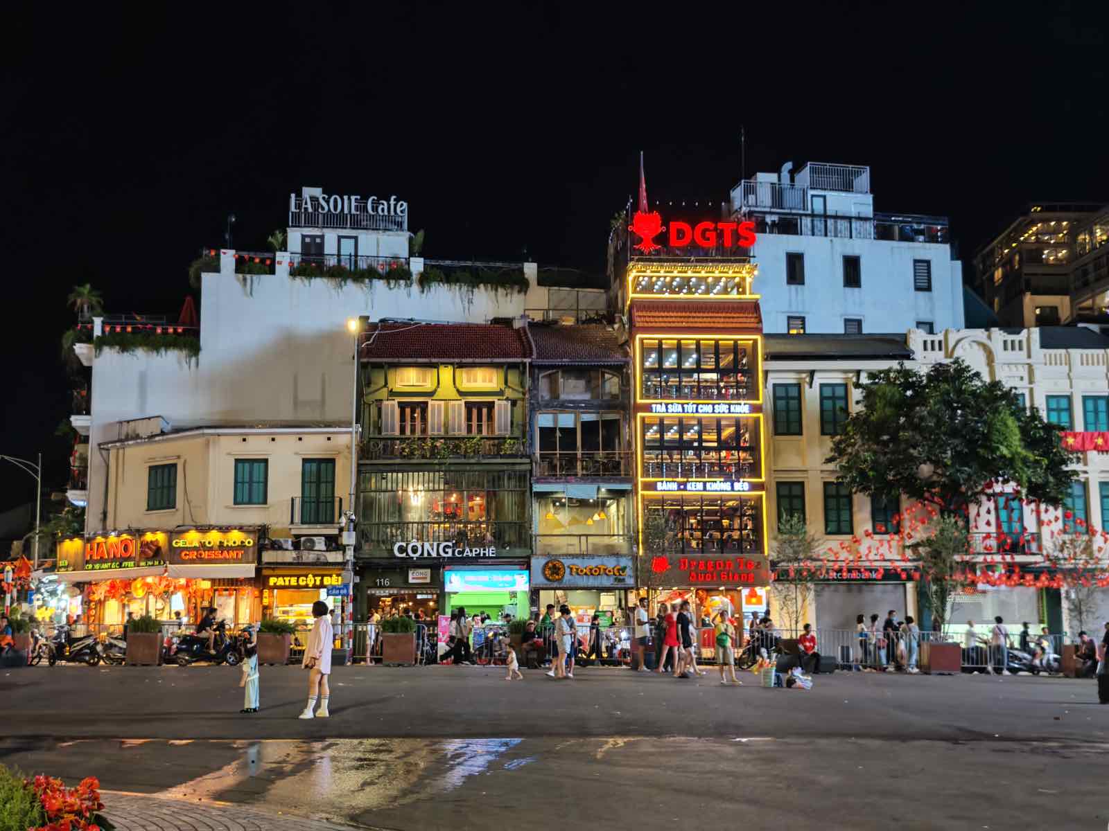 Trong điều kiện thiếu sáng, mình có dùng camera telephoto 3X để chụp một góc phố ở hồ Hoàn Kiếm. Khi zoom vào các biển hiệu từ ở dãy nhà bên đường, máy xử lý chi tiết sắc nét, rõ ràng.