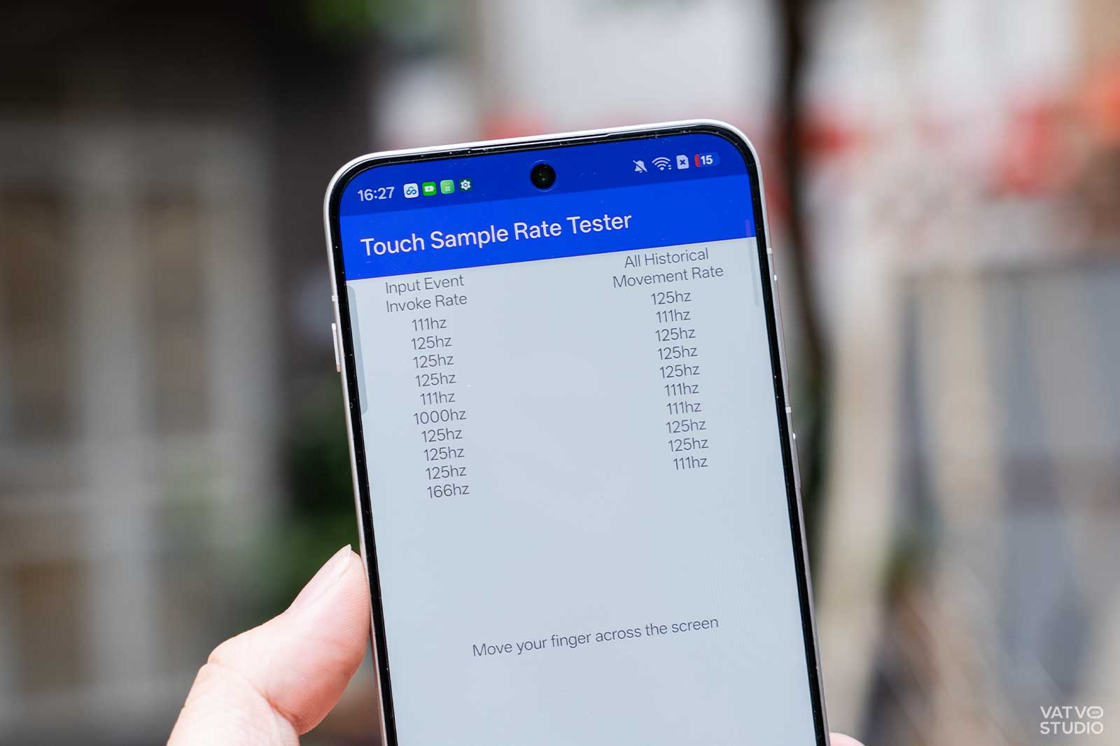 Đầu tiên, tần số lấy mẫu cảm ứng của OnePlus Ace 6 khá thấp. Thử nghiệm với phần mềm Touch Sample Rate Tester, tần số lấy mẫu của chiếc máy này chỉ là 125Hz, ngay cả khi đưa vào trong chế độ chơi game và kích hoạt các chế độ tăng độ nhạy cảm ứng. Để so sánh, tiêu chuẩn của các điện thoại tầm trung hiện nay thường sẽ đạt 250Hz – 333Hz, chưa kể các máy gaming chuyên dụng còn lên đến 500Hz hoặc cao hơn.