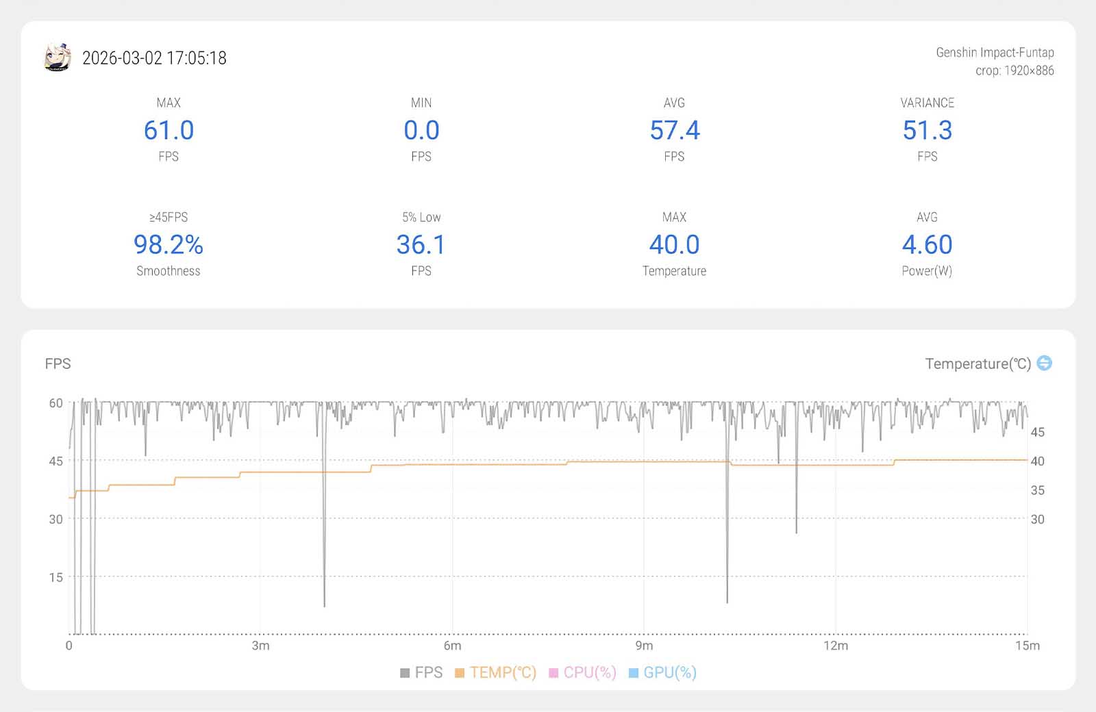 | Genshin Impact | Cao nhất + 60 FPS | 57,4 | 38 độ C |