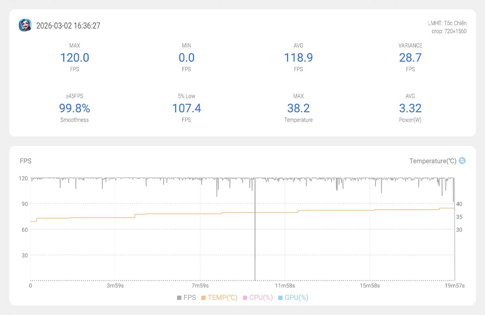| LMHT: Tốc Chiến | Cao + 120 FPS | 118,9 | 36,5 độ C |