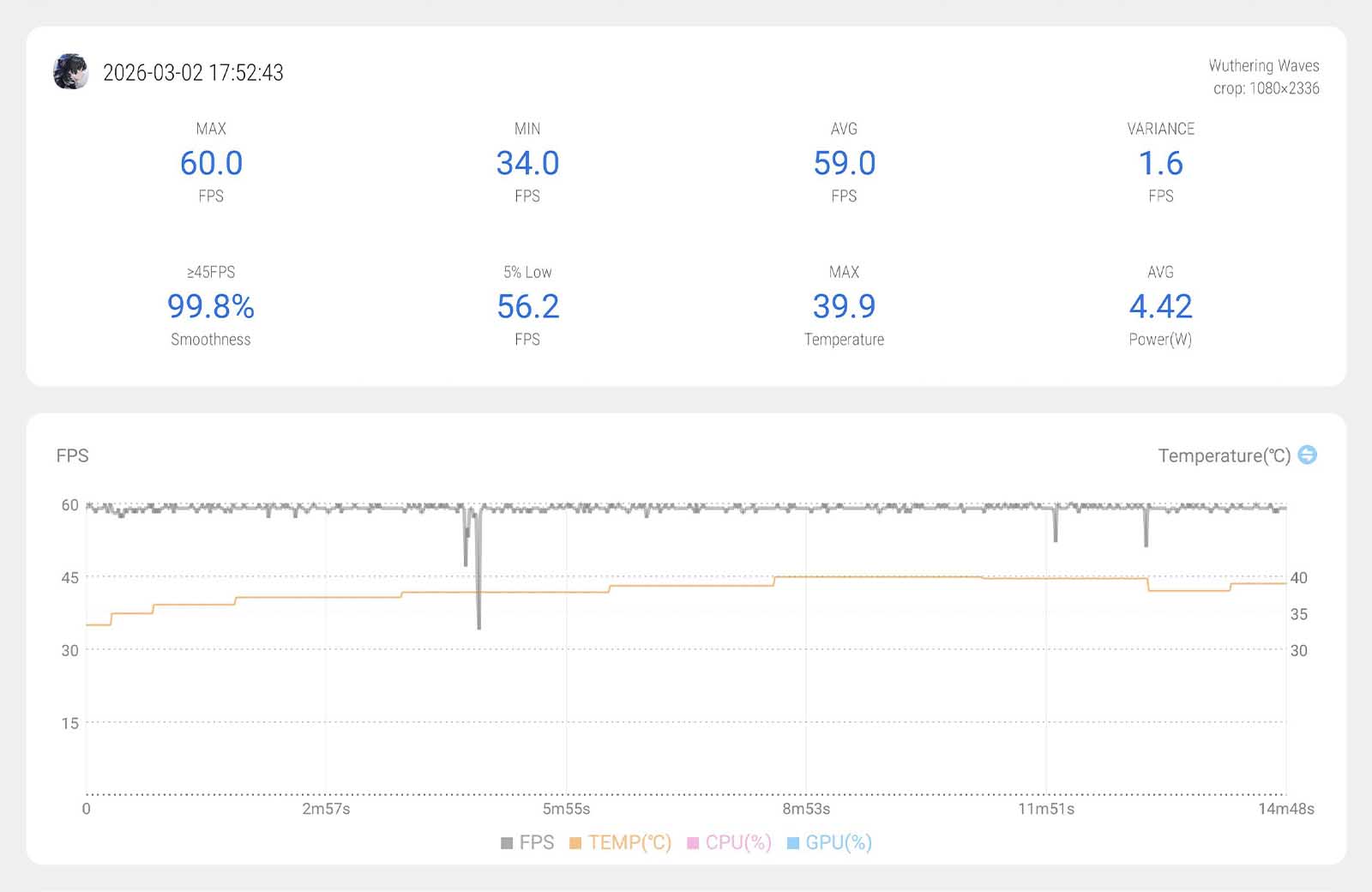 | Wuthering Waves | Cao + 60 FPS | 59 | 39,5 độ C |