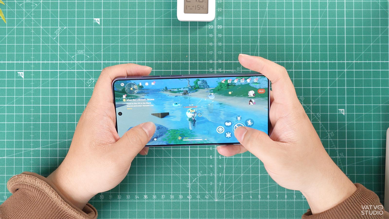 Trong quá trình chơi LMHT: Tốc Chiến, nhiệt độ tỏa ra rất ít. Khu vực vị trí đặt vi xử lý ở giữa mặt lưng chỉ hơi ấm nhẹ. Về cảm giác cầm nắm, phần khung viền đã được vát bớt độ sắc cạnh. Tuy nhiên, nếu không sử dụng ốp lưng, ngón tay áp út vẫn có thể bị cọ xát nhẹ vào cụm camera khi vuốt chạm liên tục, tạo ra một chút cấn nhẹ. Việc trang bị một chiếc ốp lưng mỏng sẽ giải quyết triệt để vấn đề công thái học này.