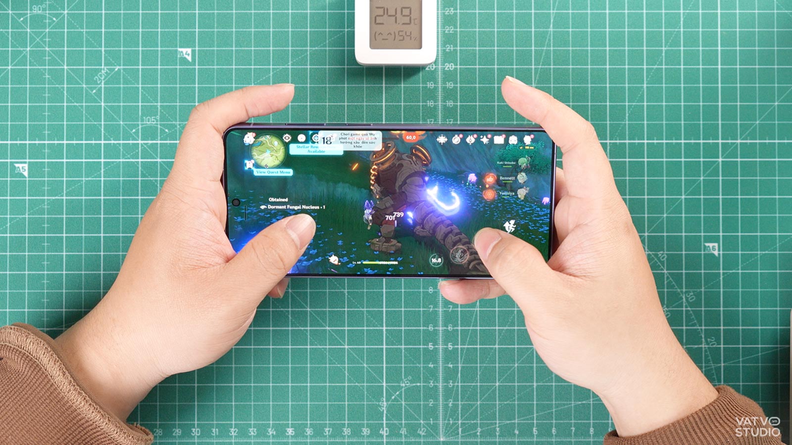 Về mặt kiểm soát nhiệt lượng khi chơi Genshin Impact, Galaxy S26 Ultra cũng làm rất tốt với những gì mình kỳ vọng. Phần nhiệt tỏa ra tập trung chủ yếu ở khu vực trung tâm mặt lưng. Tuy nhiên, lượng nhiệt lan tỏa ra các cạnh viền và khu vực nửa dưới máy là rất ít. Nhờ khung viền nhôm tản nhiệt hiệu quả, người dùng chỉ cảm thấy ấm nhẹ chứ không gặp hiện tượng quá nhiệt, đảm bảo sự thoải mái dù trải nghiệm liên tục.