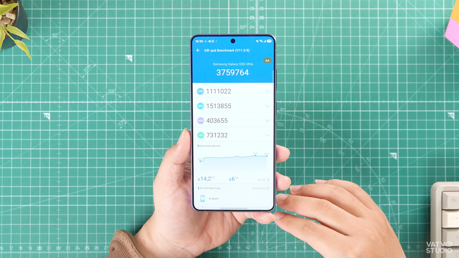 Sự nâng cấp này thể hiện rõ qua phần mềm AnTuTu Benchmark. Galaxy S26 Ultra đạt khoảng 3,75 triệu điểm, trong đó điểm số GPU đạt mức 1,5 triệu điểm. Kết quả này khá ấn tượng và ngang ngửa với nhiều mẫu máy khác cùng chạy Snapdragon 8 Elite Gen 5 trên thị trường. Nhiệt độ của máy tăng thêm khoảng 14 độ C và lượng pin hao hụt là 6% sau bài kiểm tra. Đây là một minh chứng rõ nét cho hiệu năng thuần vượt trội của chiếc máy này.