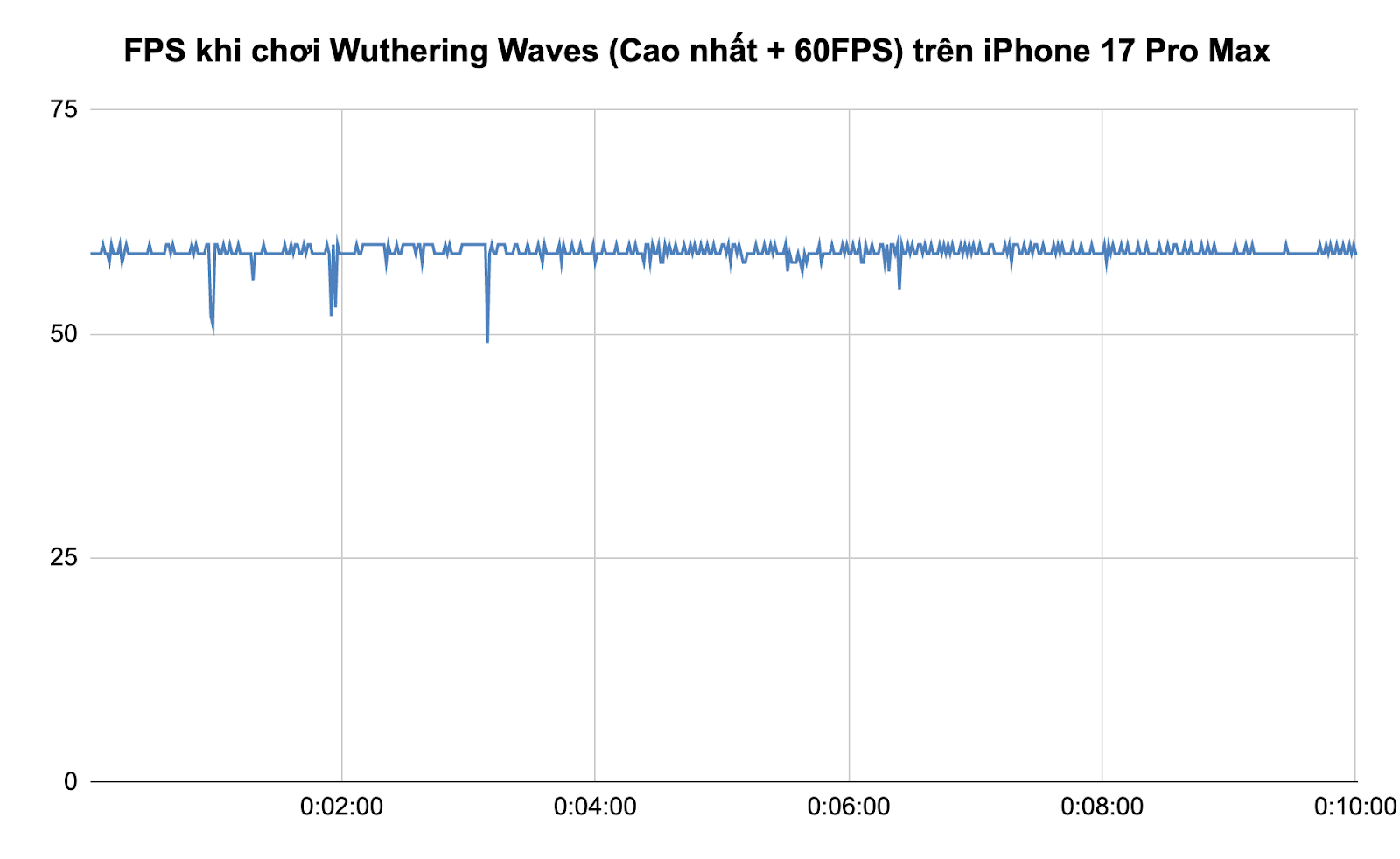 Tương tự, với Wuthering Waves, iPhone 17 Pro Max cũng cho trải nghiệm mượt mà và ổn định, FPS trung bình cũng đạt tới 59,1. Toàn bộ các thao tác điều khiển nhân vật, giao tranh với quái hay vận chiêu đều được máy xử lý mượt mà, gần như không có độ trễ, khựng hay giật.
