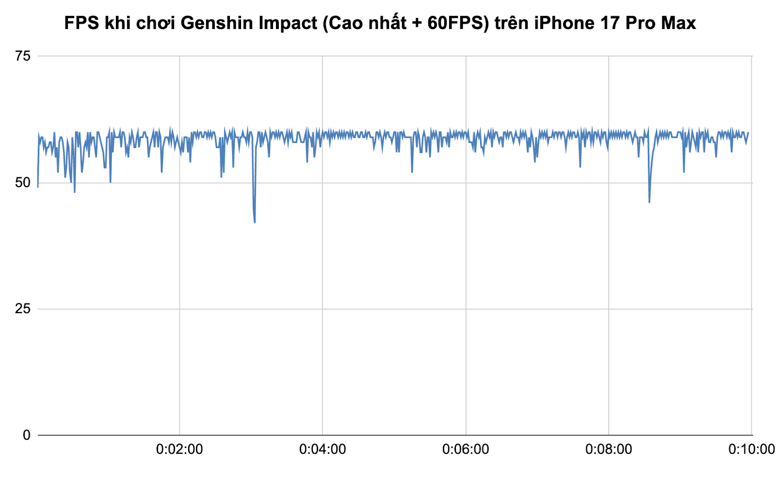 Tuy nhiên, dường như cả hai tựa game này không thể làm khó được iPhone 17 Pro Max. Đầu tiên, với Genshin Impact, iPhone 17 Pro Max cho ra biểu đồ FPS ổn định, chỉ có một số rất ít khoảng khựng nhỏ xuống khoảng 50 FPS. Trong ván game này, mình có chơi ở Sumeru, một bản đồ rất nặng với không gian rộng trong Genshin Impact. Song, mẫu máy vẫn cho ra trải nghiệm mượt mà, không gặp giật, lag ở trong các pha giao tranh và đạt FPS trung bình tới 58,5.